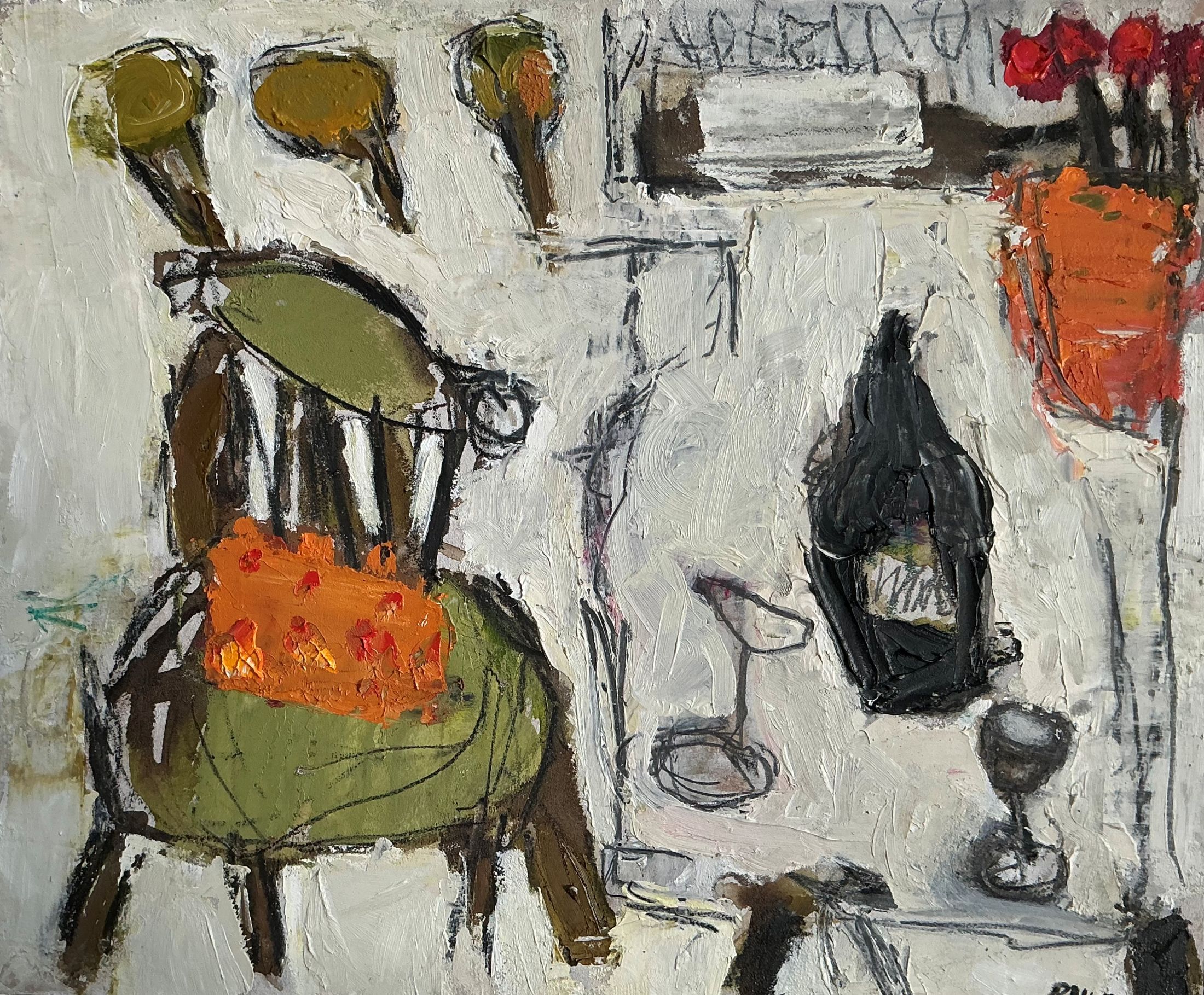 “I am interested in the domestic and the familiar, so home and garden tend to be the subjects of my paintings, crockery from the cupboards and flowers from the garden. I paint in oils and usually large scale. I love drawing, and combining it with the viscosity of paint. I have exhibited widely across the country, also in Amsterdam and Singapore.”