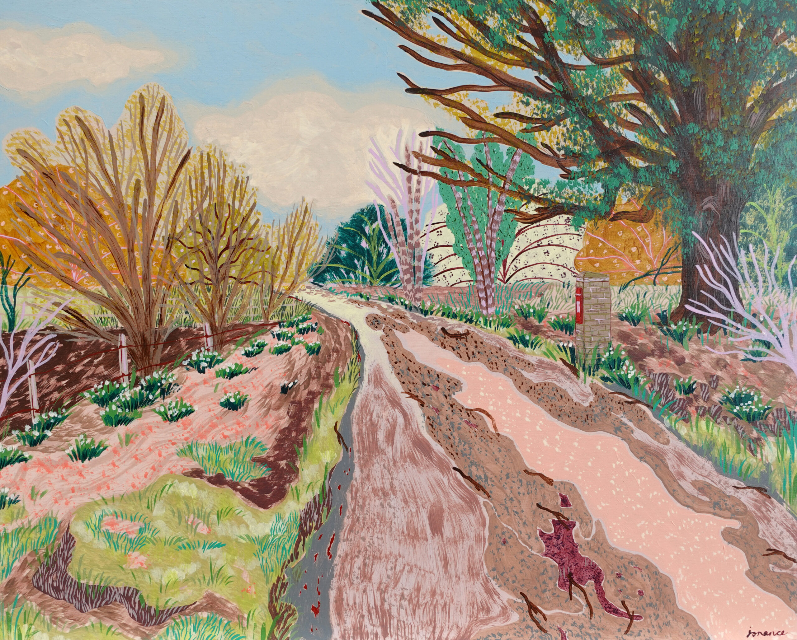 Jo primarily works with acrylic on canvas in her studio. Through location drawing, Jo takes note of her surrounding countryside, and the flora and fauna within. Continuously informed by the British landscape throughout the seasons, there’s an organic pull for Jo to document the natural world through her work. A key part of her practice is painting en plein air and working in her sketchbook amidst the elements – it’s almost meditative.