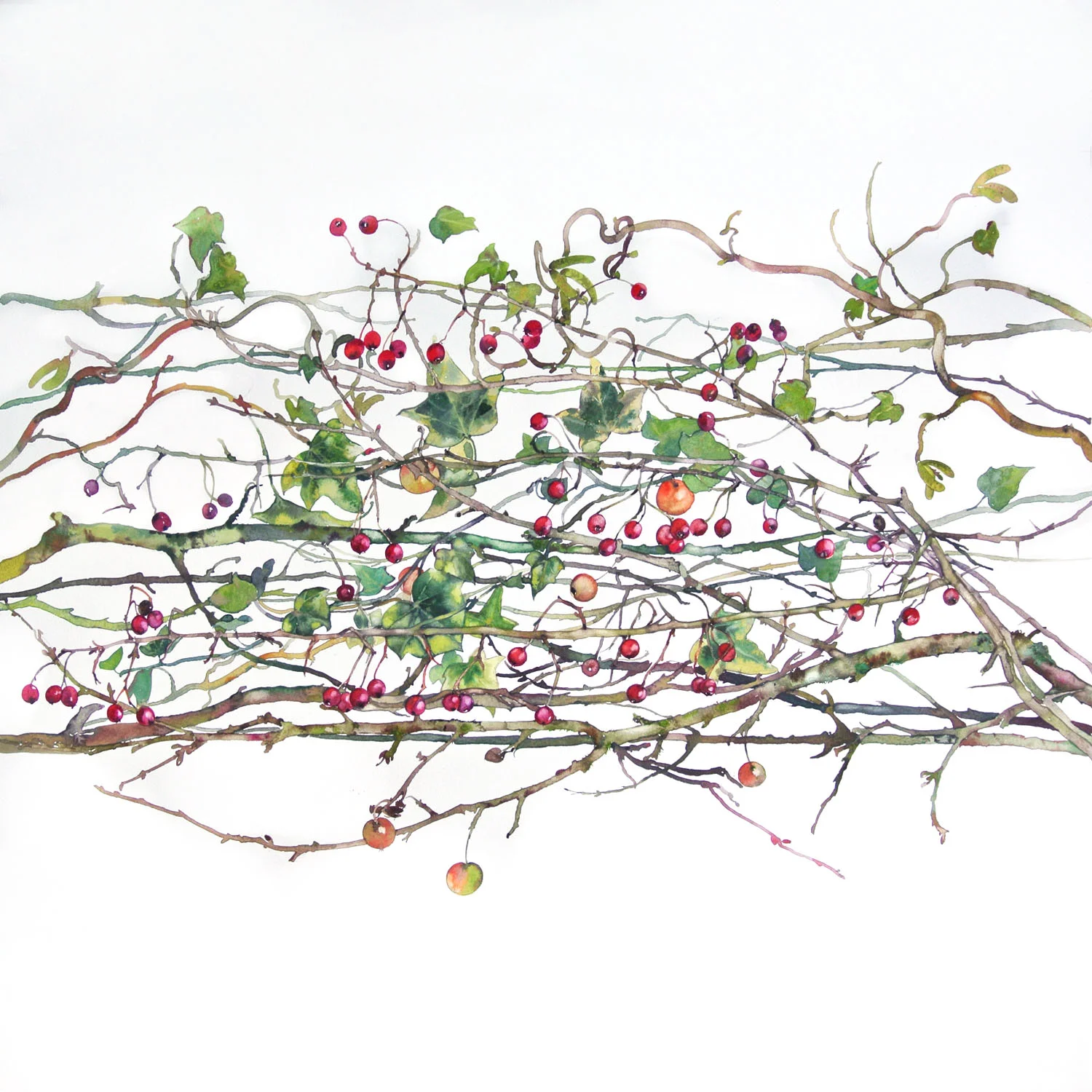 After moving from London to rural Leicestershire to raise her family Helen made the transition from Textile Designer to Painting. This transition has allowed her to concentrate on developing her work as a watercolour artist. Through this development Helen has become increasingly interested in depicting the detail, colour and form of plant life. Watercolour as a medium with its clarity and gentle merging of colour has an unpredictability, which Helen finds both challenging and exciting. Working from her home studio Helen’s still lifes are inspired by nature and the seasons, incorporating collections of plants and objects such as leaves, flowers, branches, nests all found on daily walks, in her garden or on holiday. Helen also has a collection of British Ceramic Wares, which often have a place within her compositions. Helen exhibits regularly at Cambridge Contemporary Art Gallery. She is a fellow member of the Society of Botanical Artists and exhibited in the Society of Botanical Artists Plantae Exhibition 2019, which took place at the Mall Galleries in London.