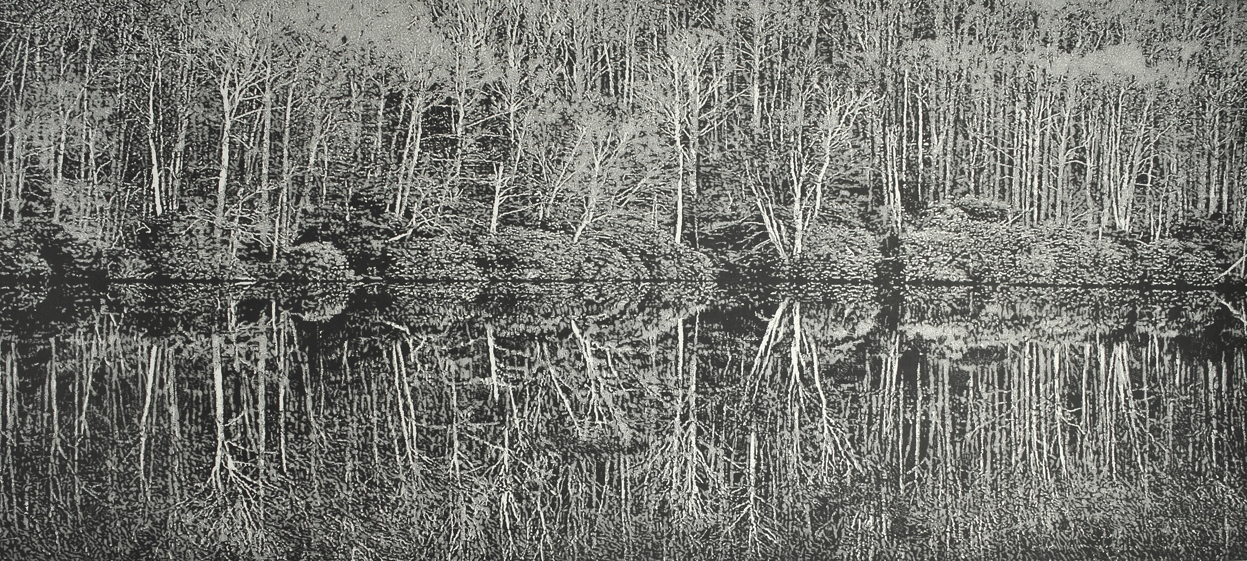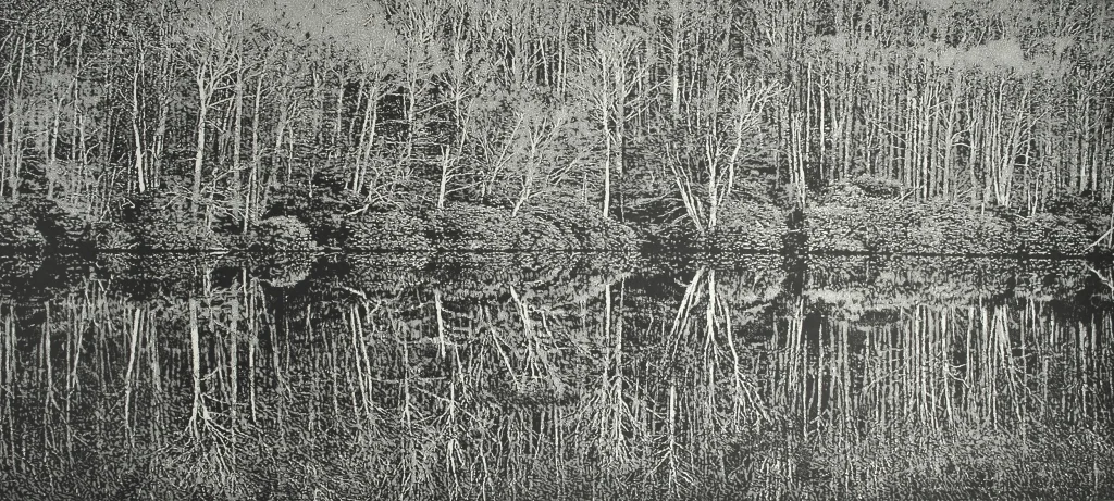 The most recent series by Trevor Price are drypoint and engraved relief prints. Using a polycarbonate 2mm sheet he has carved and scraped the plate with a drypoint needle and a dremmel. This process is very time consuming and unforgiving if mistakes are made. With ink then rolled over the surface, it is sent through an etching press with damp paper over the plate. The artist’s intention is for the viewer to get lost in the mark making and abstractions when viewed close up, but from a distance for the images to become highly representational and almost photographic. There is however no photographic process involved and everything is handmade and printed by hand.