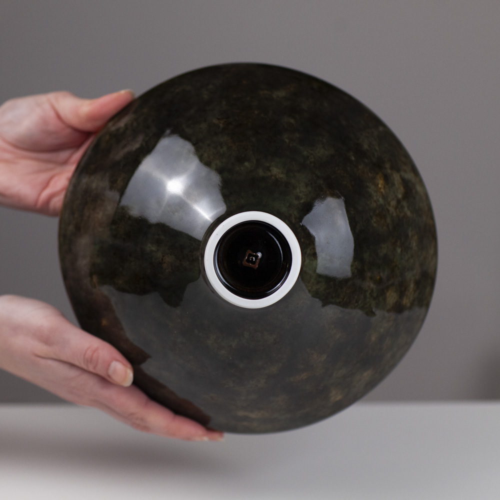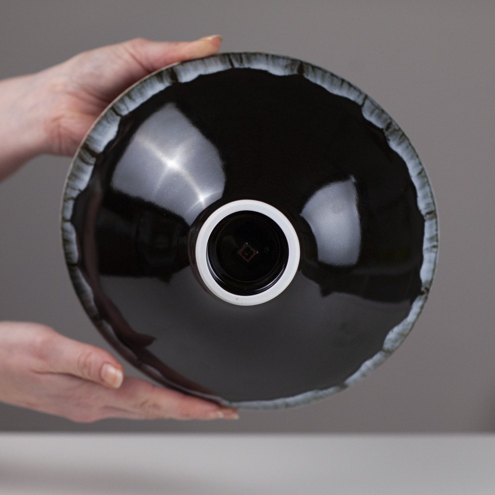 “There are few things that offer me greater satisfaction than being at the wheel, throwing or turning. My work and knowledge of clay occupies a fairly narrow band of the extremely broad ceramic spectrum but that band does go deep. I have only ever used porcelain and for the most part, only two glazes. I largely make work in small batches and for these, repetition is key; but the word “repetition” belies the reality that each piece represents a separate examination of the form in question and is a nuanced response to a previous incarnation.” Over the past few years, Chris has been making non-functional, interactive installation pieces which a sense of playfulness, incorporating elements of theatre which is a nod to his previous existence as an actor. All his work is thrown Limoges porcelain which is fired in a gas kiln with tenmoku and celadon glazes.