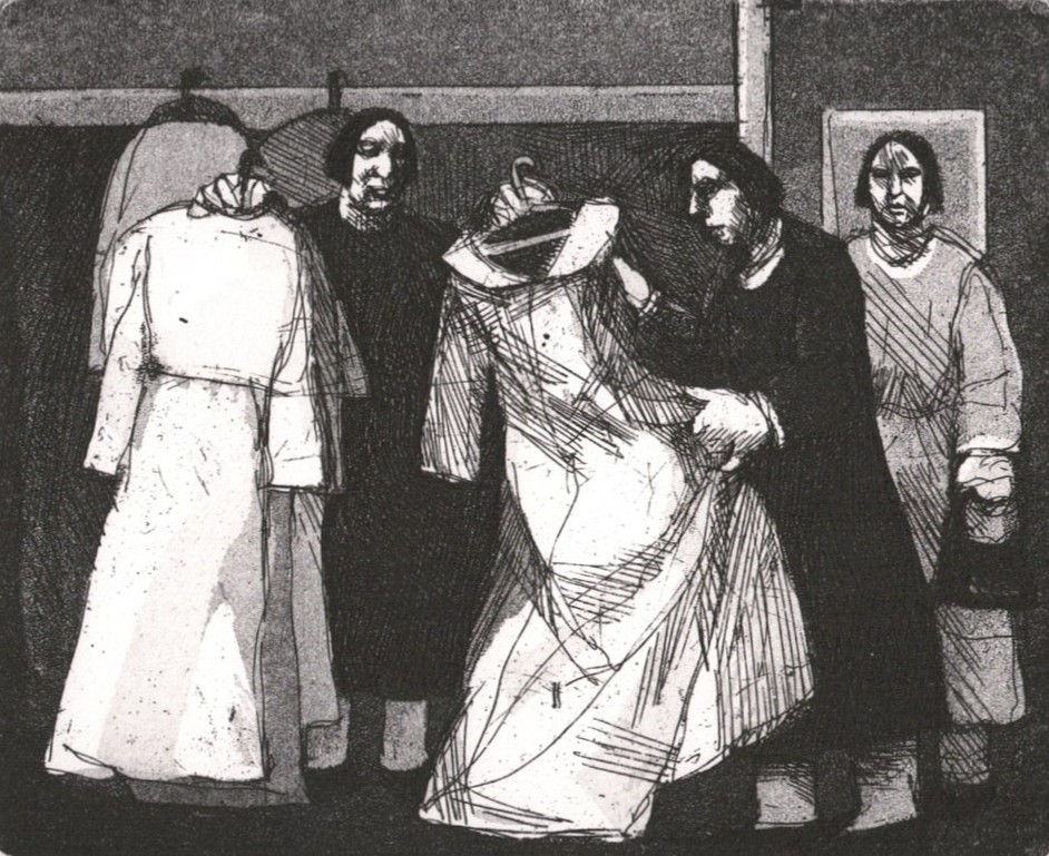 Her grandfather’s hotel in Reykjavik has provided a wealth of imagery. In some works she created a world of her own with imagined people in strange situations. Her work contains a wry humour that enhances the surreal and timeless qualities she creates when dealing with her favourite topic, people.