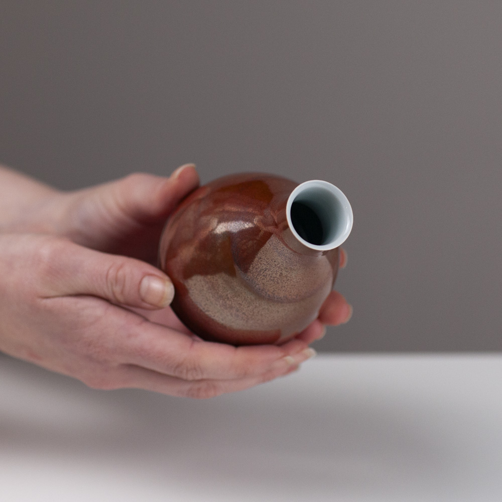 “There are few things that offer me greater satisfaction than being at the wheel, throwing or turning. My work and knowledge of clay occupies a fairly narrow band of the extremely broad ceramic spectrum but that band does go deep. I have only ever used porcelain and for the most part, only two glazes. I largely make work in small batches and for these, repetition is key; but the word “repetition” belies the reality that each piece represents a separate examination of the form in question and is a nuanced response to a previous incarnation.” Over the past few years, Chris has been making non-functional, interactive installation pieces which a sense of playfulness, incorporating elements of theatre which is a nod to his previous existence as an actor. All his work is thrown Limoges porcelain which is fired in a gas kiln with tenmoku and celadon glazes.