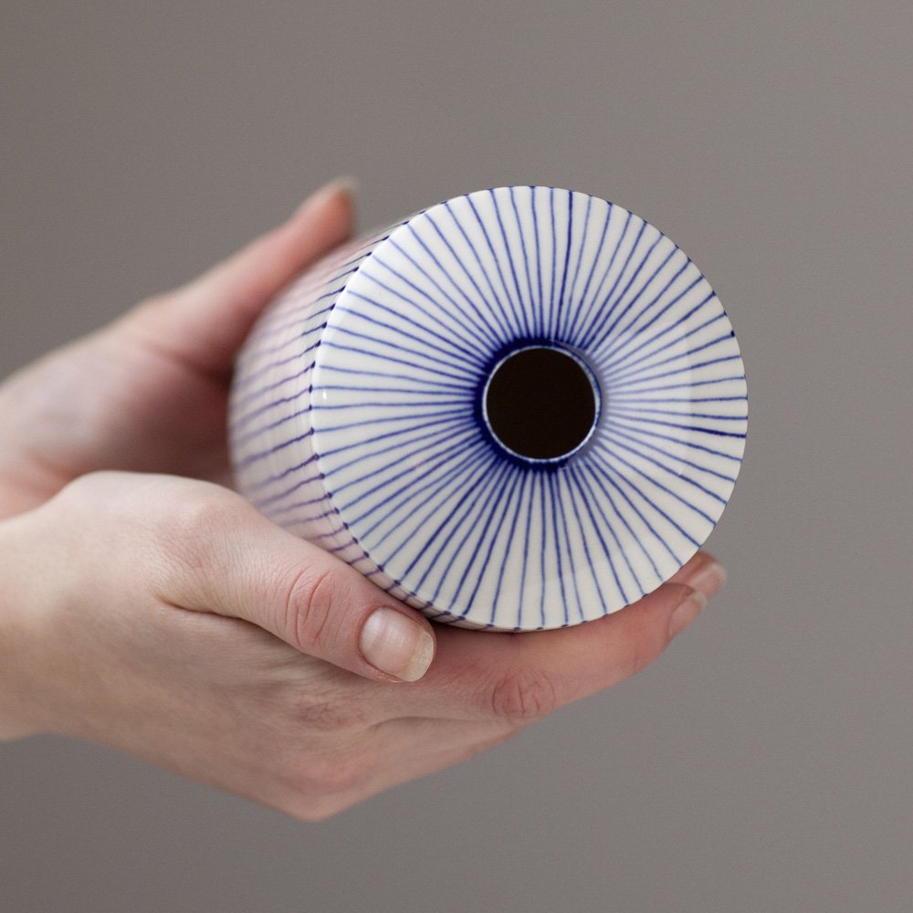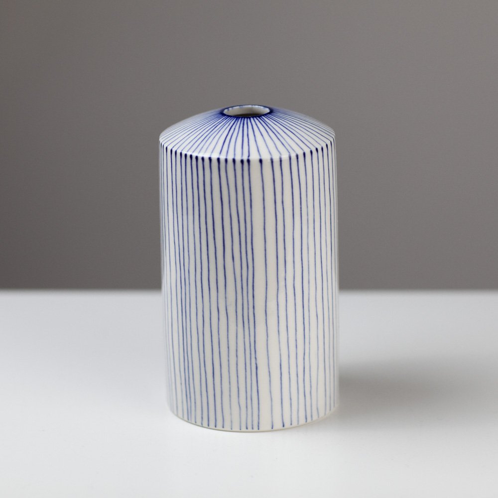 Tamsin works in wheel-thrown, hand-painted porcelain. The decoration is an exploration of mark-making in embroidery, knitting, textiles and print-making. These influences drive her to work in the simplified lines and marks of thread or block-print. She is drawn to a monochrome colour palette, in particular the blue and white of ‘traditional’ ceramics. Tamsin finds the clean, calm shapes of Japanese ceramics particularly compelling and reflections of these lines appear in her work, providing a contrast to the sometimes intricate patterns applied to the surface.