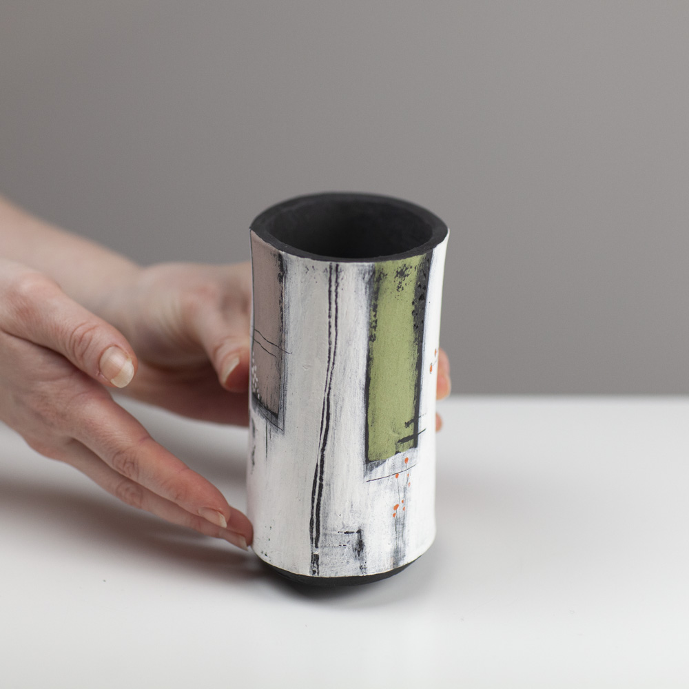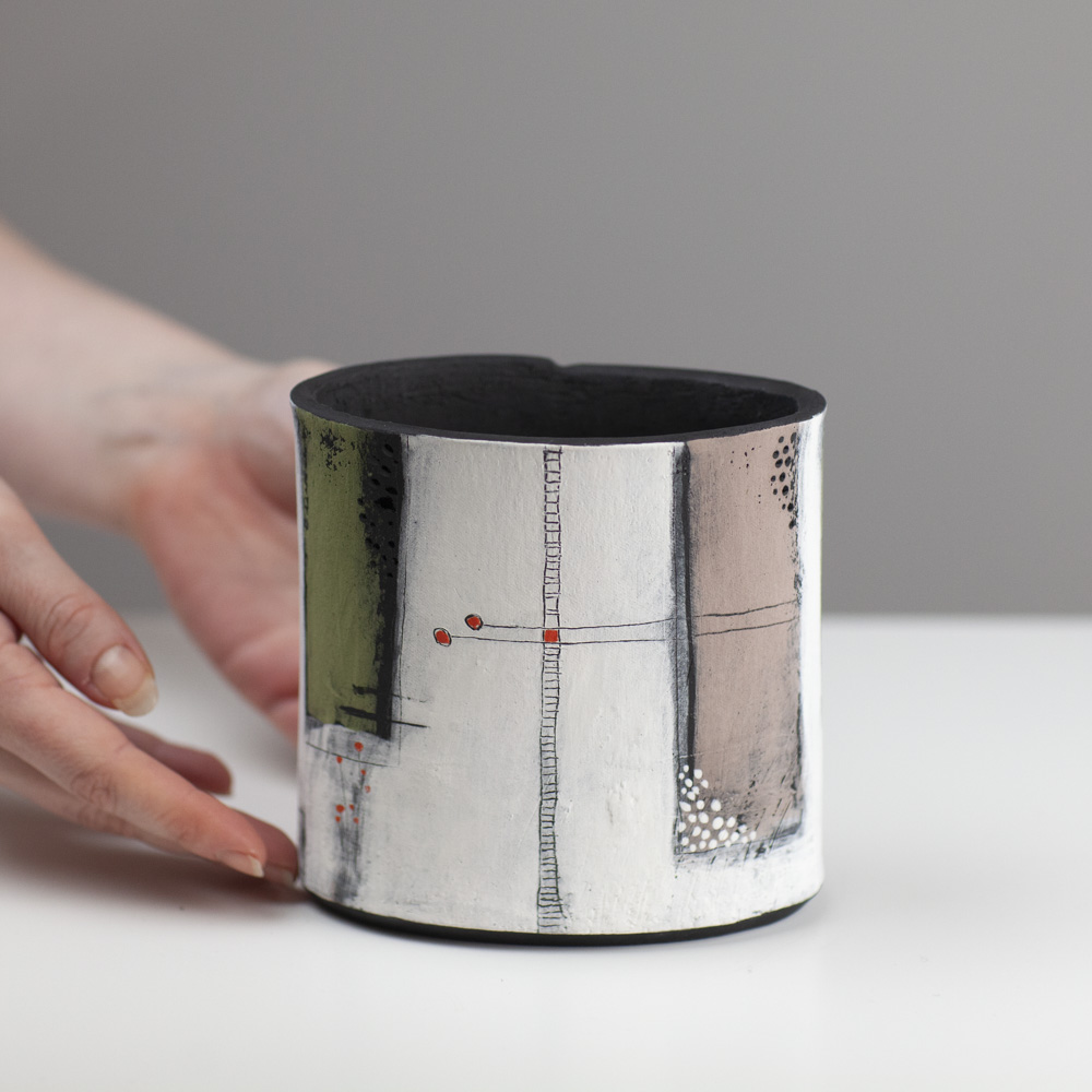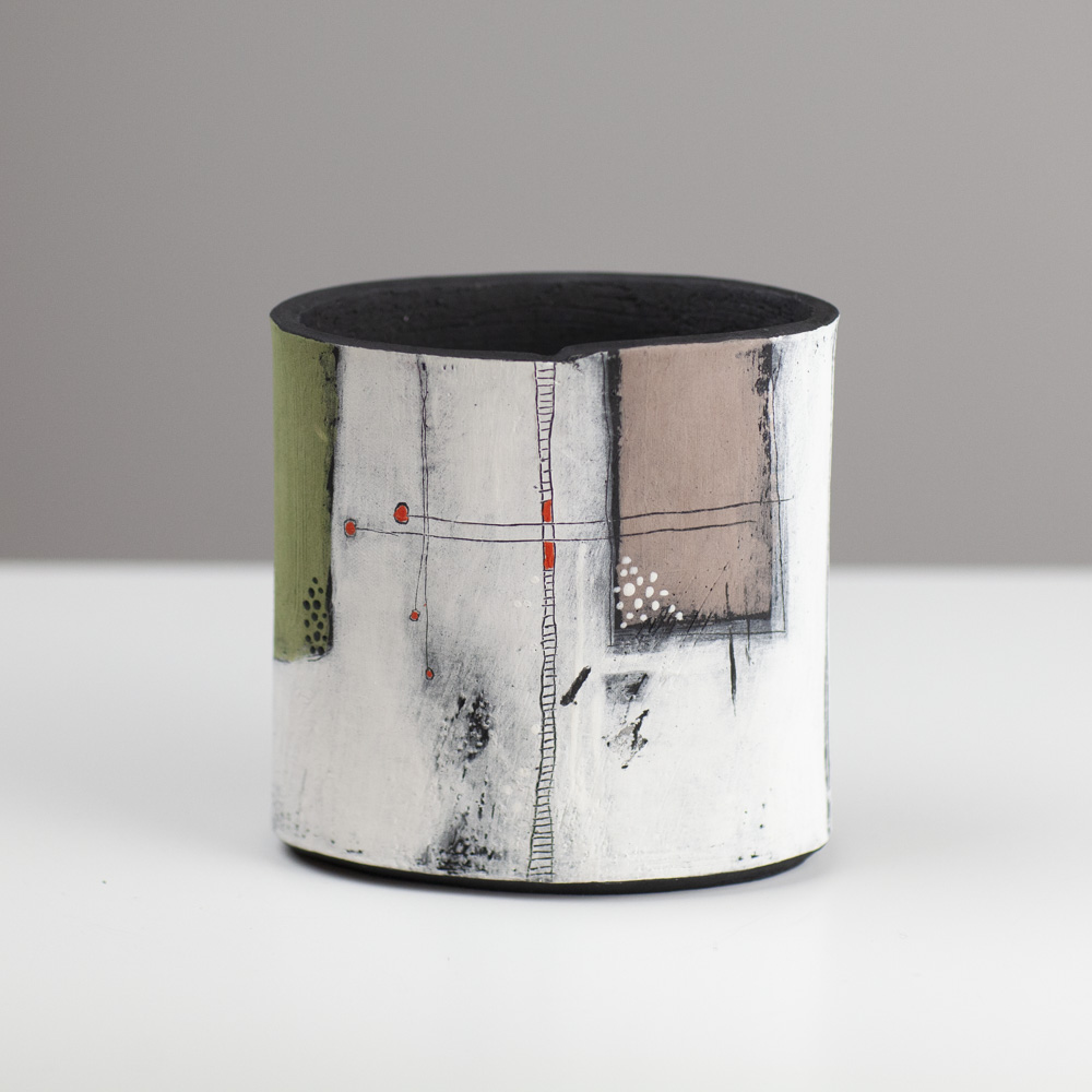 Her work is predominantly hand-built, using coiling, pinching, and slab techniques rather than the wheel, resulting in distinctive sculptural and decorative forms. Known for her strong use of colour, abstract surface design, and expressive shapes, Jane creates pieces that are often earthenware-fired, sometimes burnished or smoke-fired. Her artistic approach has been influenced by time spent in Asia, particularly its emphasis on simplicity and form