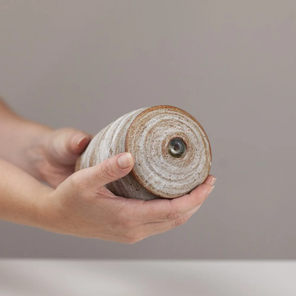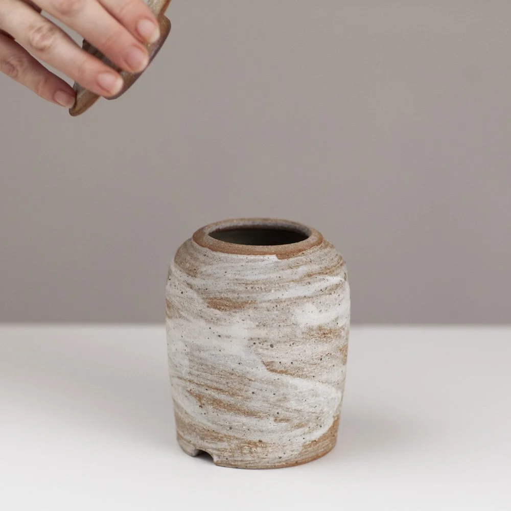 Born September 1974, Tim lives and works in Carmarthenshire, Wales. “Fluidity, fullness and lift are attributes I look to impart into my pots, always trying to bring the softness and suppleness of the material through to the end of the processes. This combined with the alchemic adventure of taking a base material and transforming it into objects of use and beauty is the satisfying goal.” A variety of different voices inform Tim’s work, from East to West, Korea to Marshall, Karatsu to MacKenzie. “I make a variety of forms, ranging from vases and lidded containers to drinking cups and pouring bowls. All work is stoneware and most of it is thrown and turned on a slow turning kick wheel but I also produce various slab built plates and trays. All the work is fired to between 1280°C–1300°C in a gas and wood kiln.”