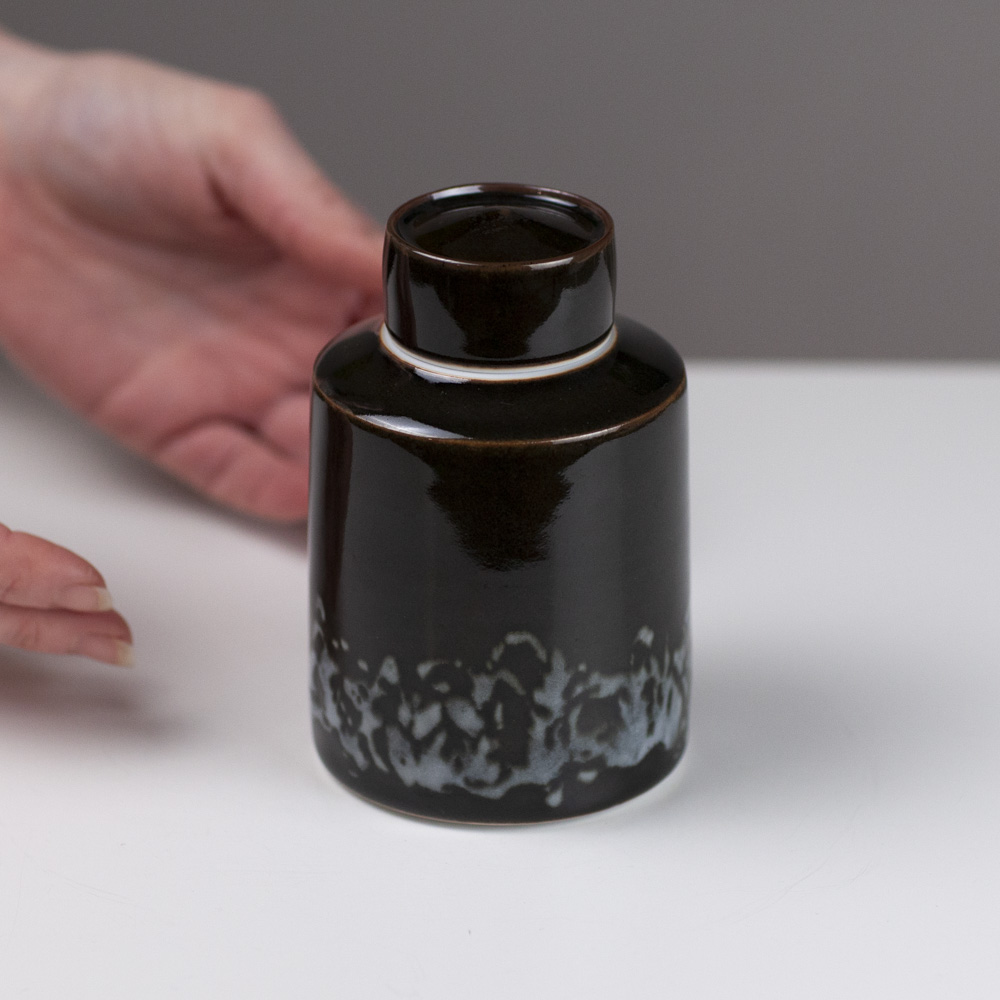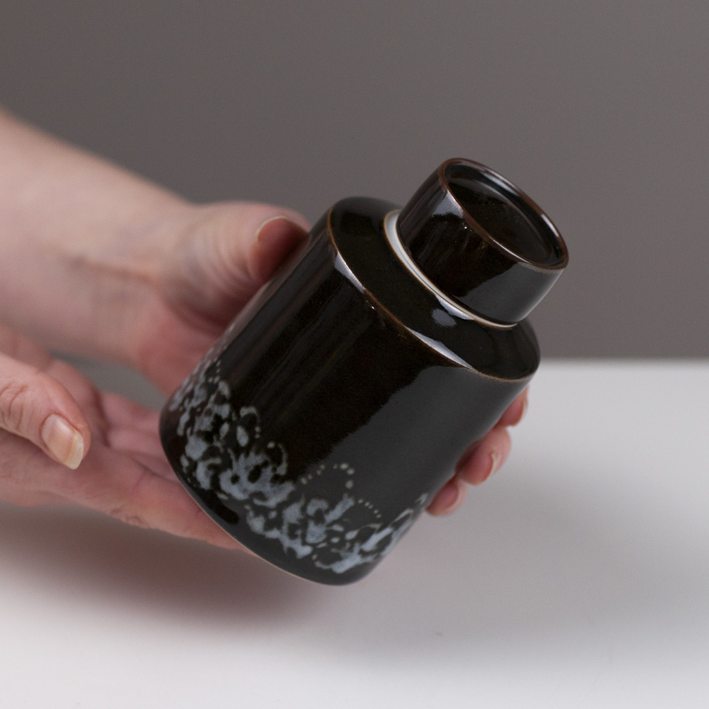 “There are few things that offer me greater satisfaction than being at the wheel, throwing or turning. My work and knowledge of clay occupies a fairly narrow band of the extremely broad ceramic spectrum but that band does go deep. I have only ever used porcelain and for the most part, only two glazes. I largely make work in small batches and for these, repetition is key; but the word “repetition” belies the reality that each piece represents a separate examination of the form in question and is a nuanced response to a previous incarnation.” Over the past few years, Chris has been making non-functional, interactive installation pieces which a sense of playfulness, incorporating elements of theatre which is a nod to his previous existence as an actor. All his work is thrown Limoges porcelain which is fired in a gas kiln with tenmoku and celadon glazes.