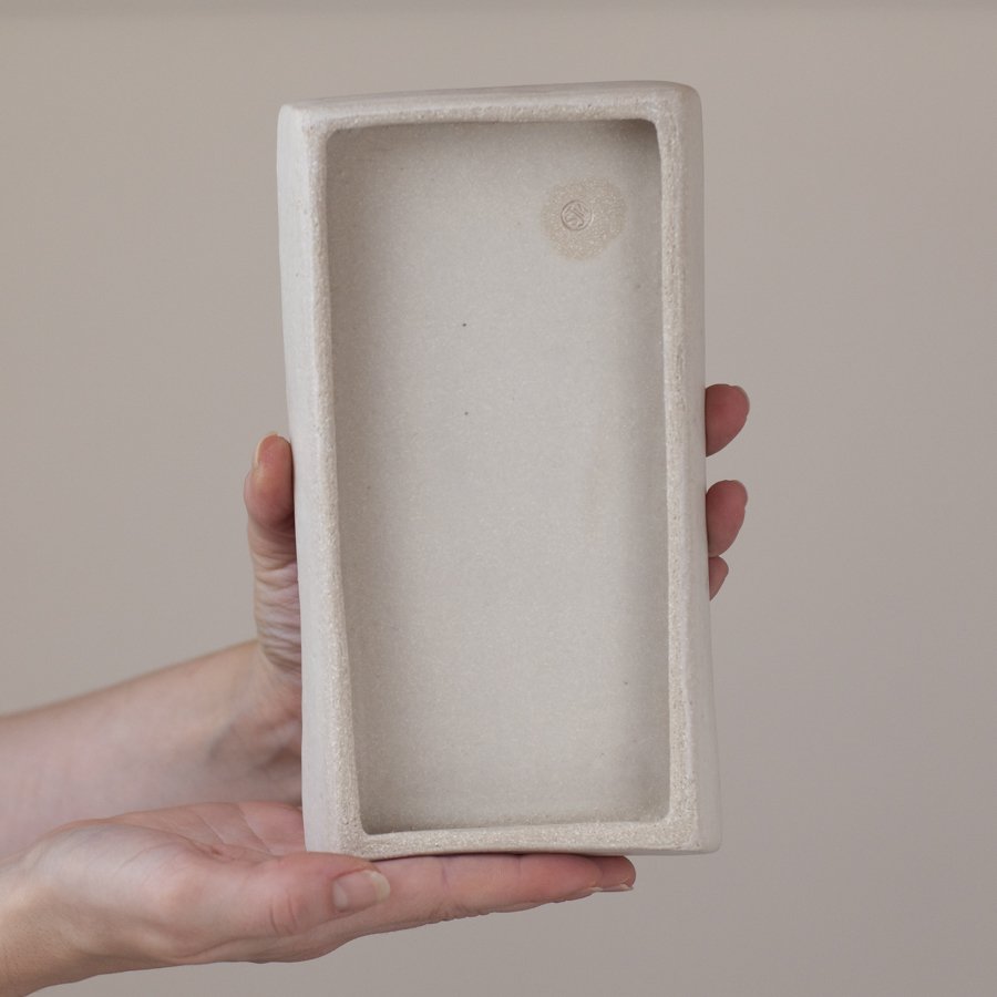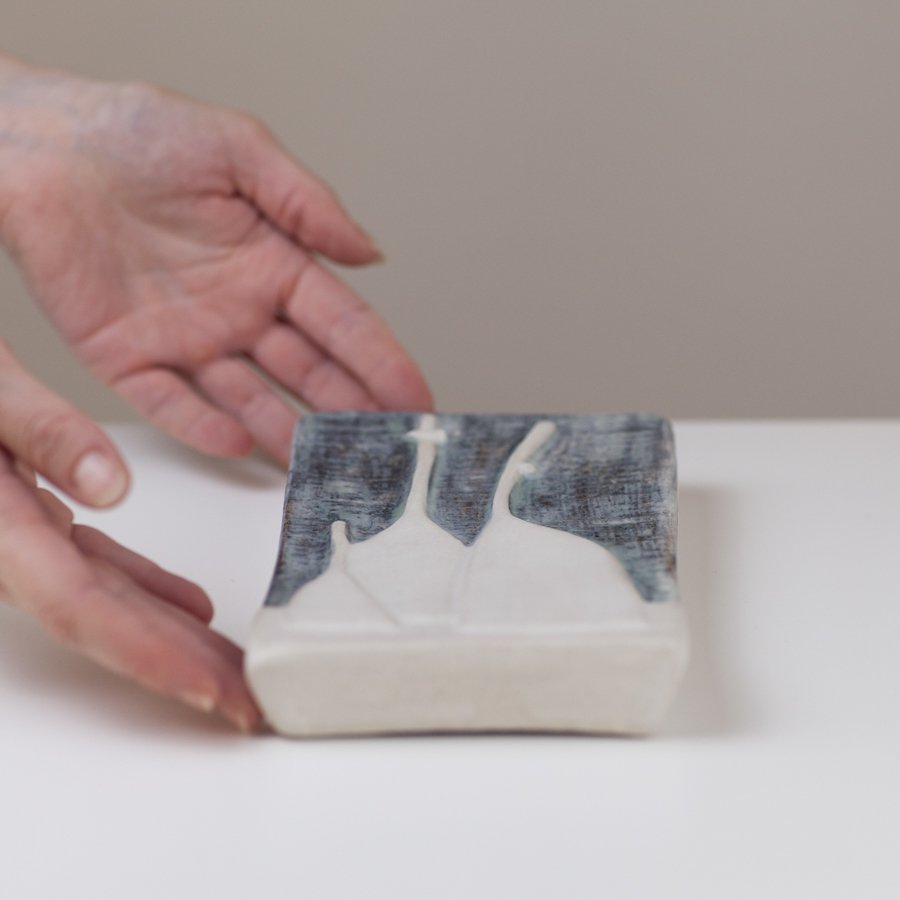 Slab relief. Brushed porcelain slip. Glazed