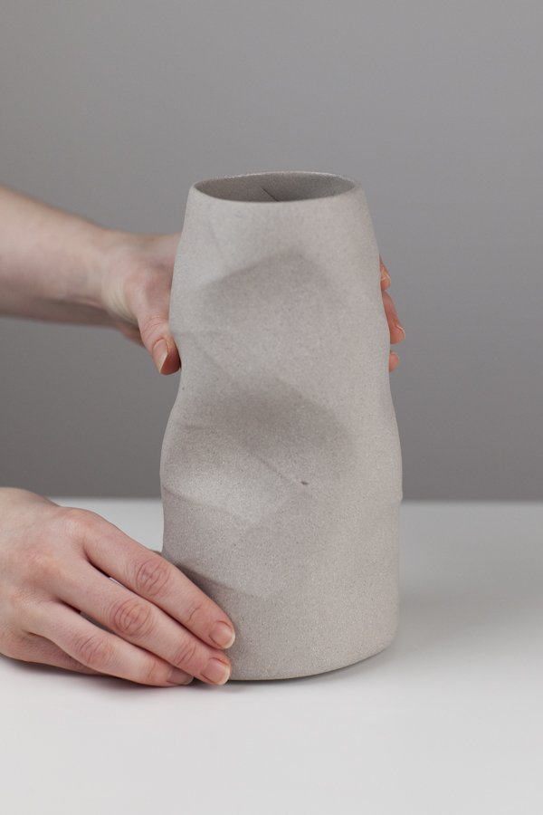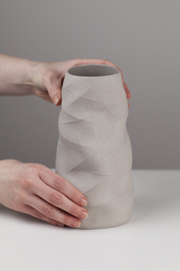 Sally’s ceramics are inspired by her passion for the material. She aims to create a sense of movement and physicality in her pieces; she does this by marking and drawing into soft slabs of clay that are then formed into cylinders and manipulated. This making process allows her to create unique forms with fluid contours and shadows. Natural colours and unglazed surfaces are used to complement the form and provide a subtle tactile quality to her vessels. Her primary material is a grogged porcelain which she then blends with other clays, oxides and stains in order to create her distinct colour palette.