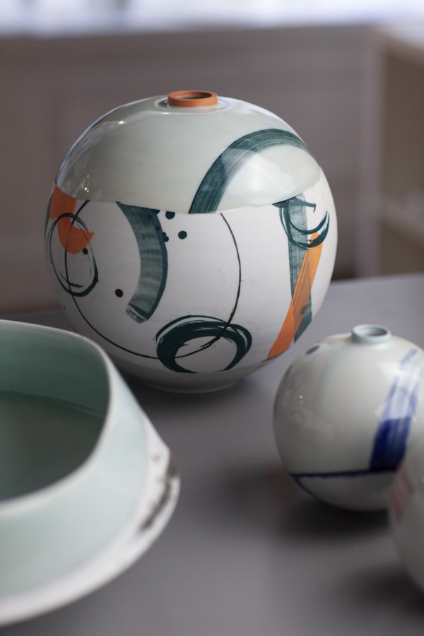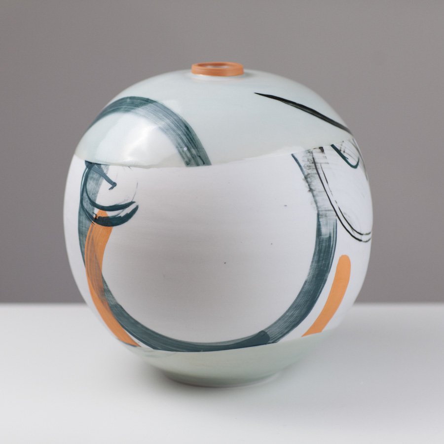 Adam’s work centres on the potters wheel. Traditional eastern forms inspire him, but spontaneity as a means of personal expression is key to his work. The exuberant action of throwing is enhanced by a continued experimentation through process, form and colour. Mark Making is intuitive, sometimes relating to form, or process of making, sometimes it’s part of a personal narrative