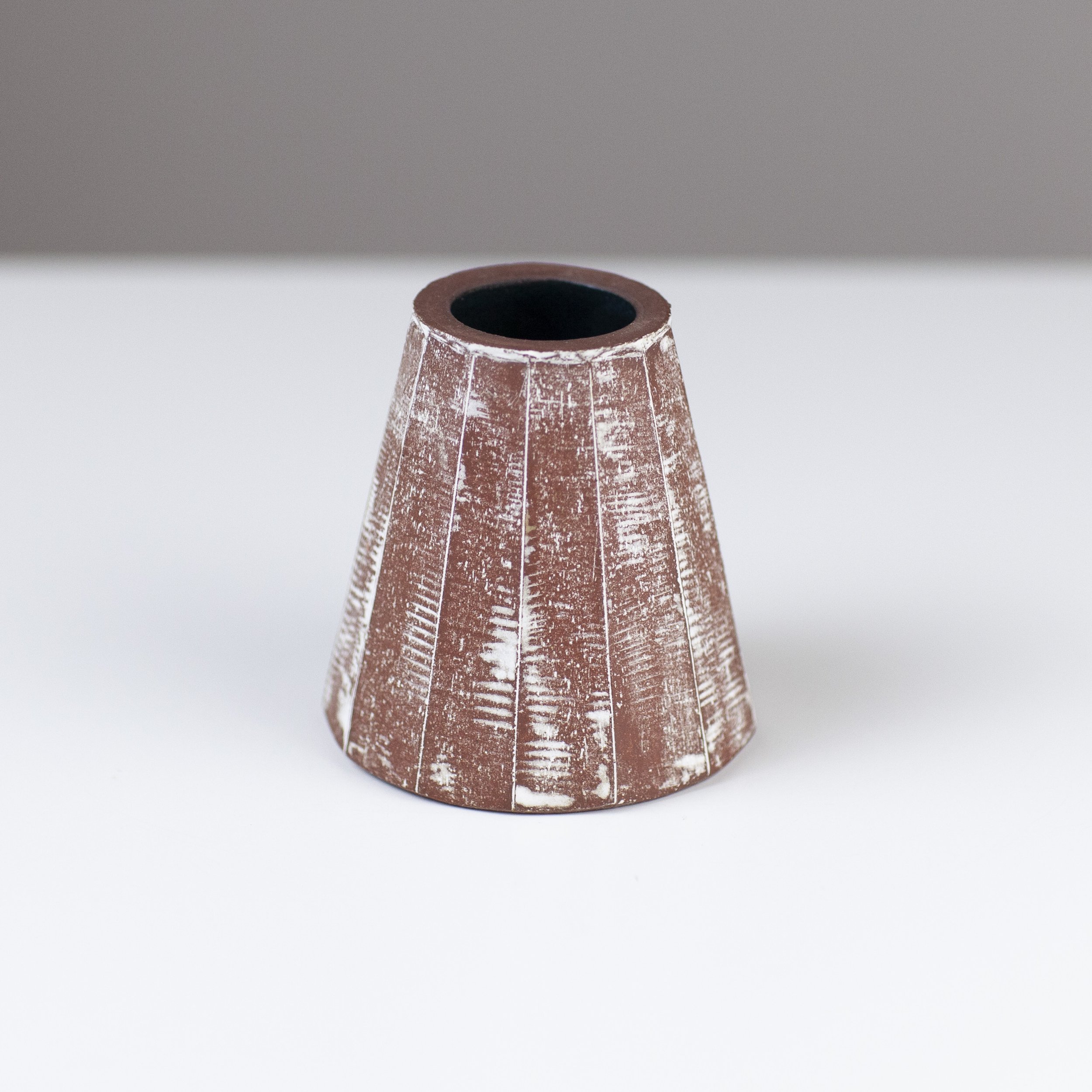 Emily is currently working with both porcelain and red stoneware clay. These contrasting clays provide the bright white, and chocolate brown backgrounds, on which the glazes react. The potter’s wheel is central to Emily’s studio practice, but extends her repertoire of forms by faceting, carving and altering the pots at the leather hard stage. She has developed a range of matt stoneware barium glazes. After graduating with a degree in Ceramics from Bristol Polytechnic in 1987, Emily returned to her home town of London, enjoying working within a shared workshop environment. A move to the countryside in the late 1990’s signalled a change in Emily’s work. Architectural influences gave way to organic ones. The rolling hills and ploughed furrows of North Hampshire were reflected in the carved lines within the pots. Inspiration was also drawn from found objects such as knapped flints and old metal cogs.