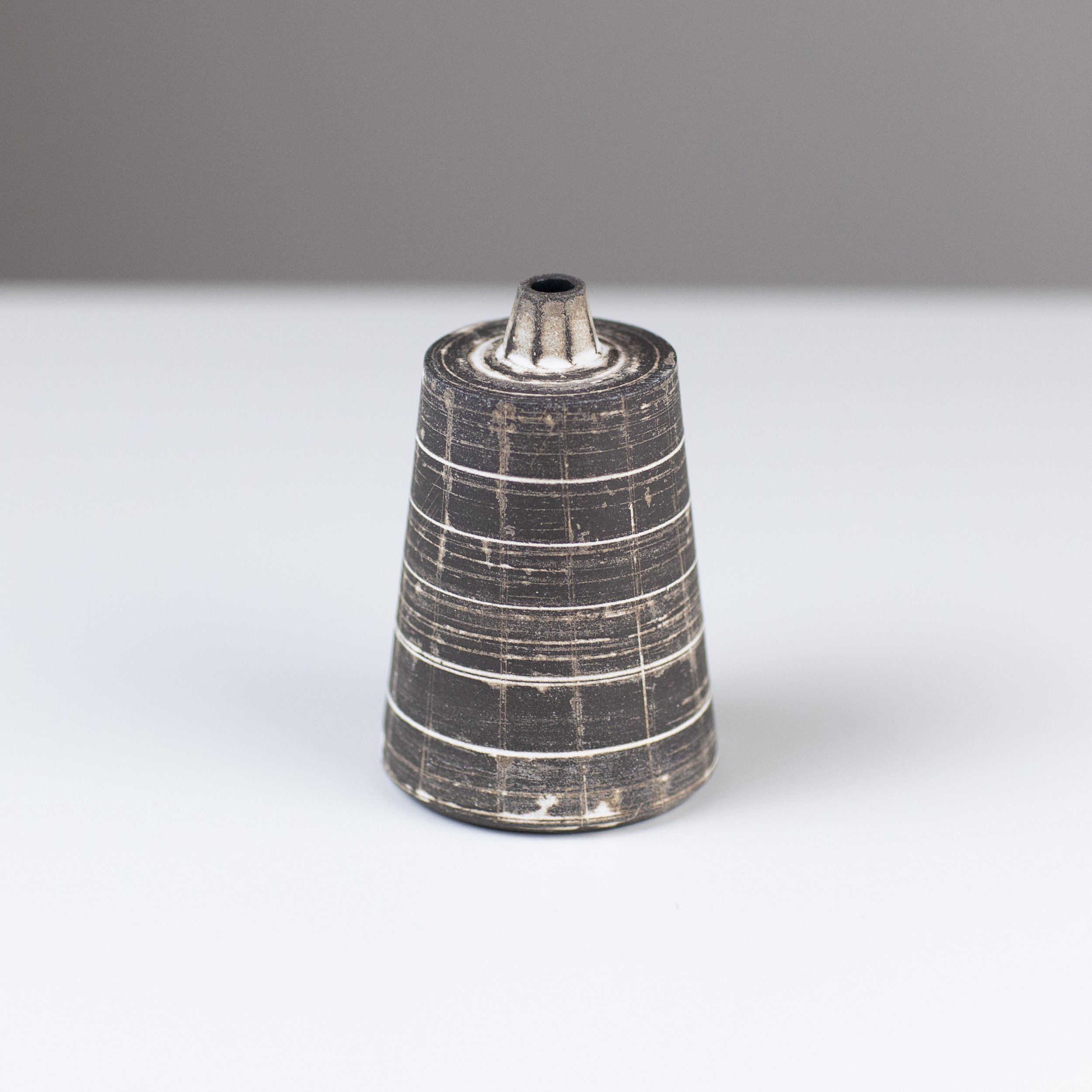 Emily is currently working with both porcelain and red stoneware clay. These contrasting clays provide the bright white, and chocolate brown backgrounds, on which the glazes react. The potter’s wheel is central to Emily’s studio practice, but extends her repertoire of forms by faceting, carving and altering the pots at the leather hard stage. She has developed a range of matt stoneware barium glazes. After graduating with a degree in Ceramics from Bristol Polytechnic in 1987, Emily returned to her home town of London, enjoying working within a shared workshop environment. A move to the countryside in the late 1990’s signalled a change in Emily’s work. Architectural influences gave way to organic ones. The rolling hills and ploughed furrows of North Hampshire were reflected in the carved lines within the pots. Inspiration was also drawn from found objects such as knapped flints and old metal cogs.