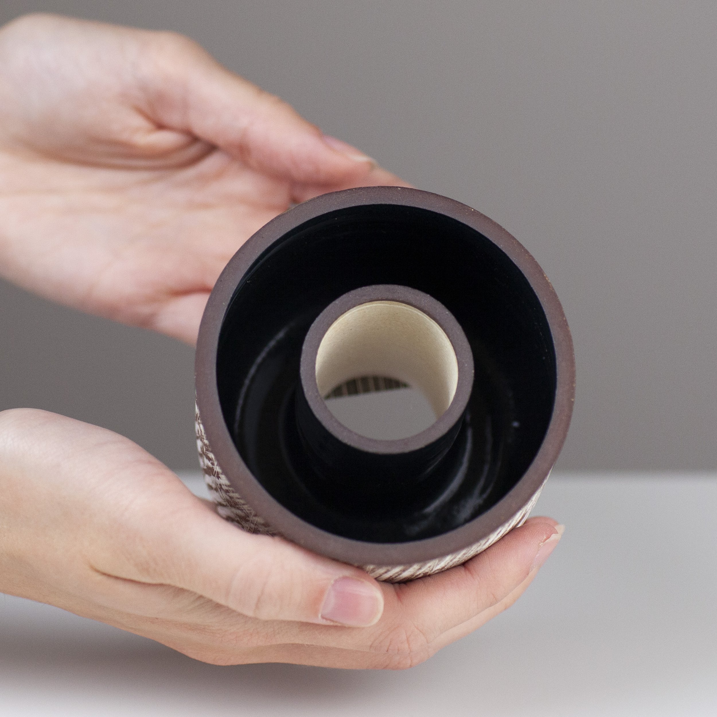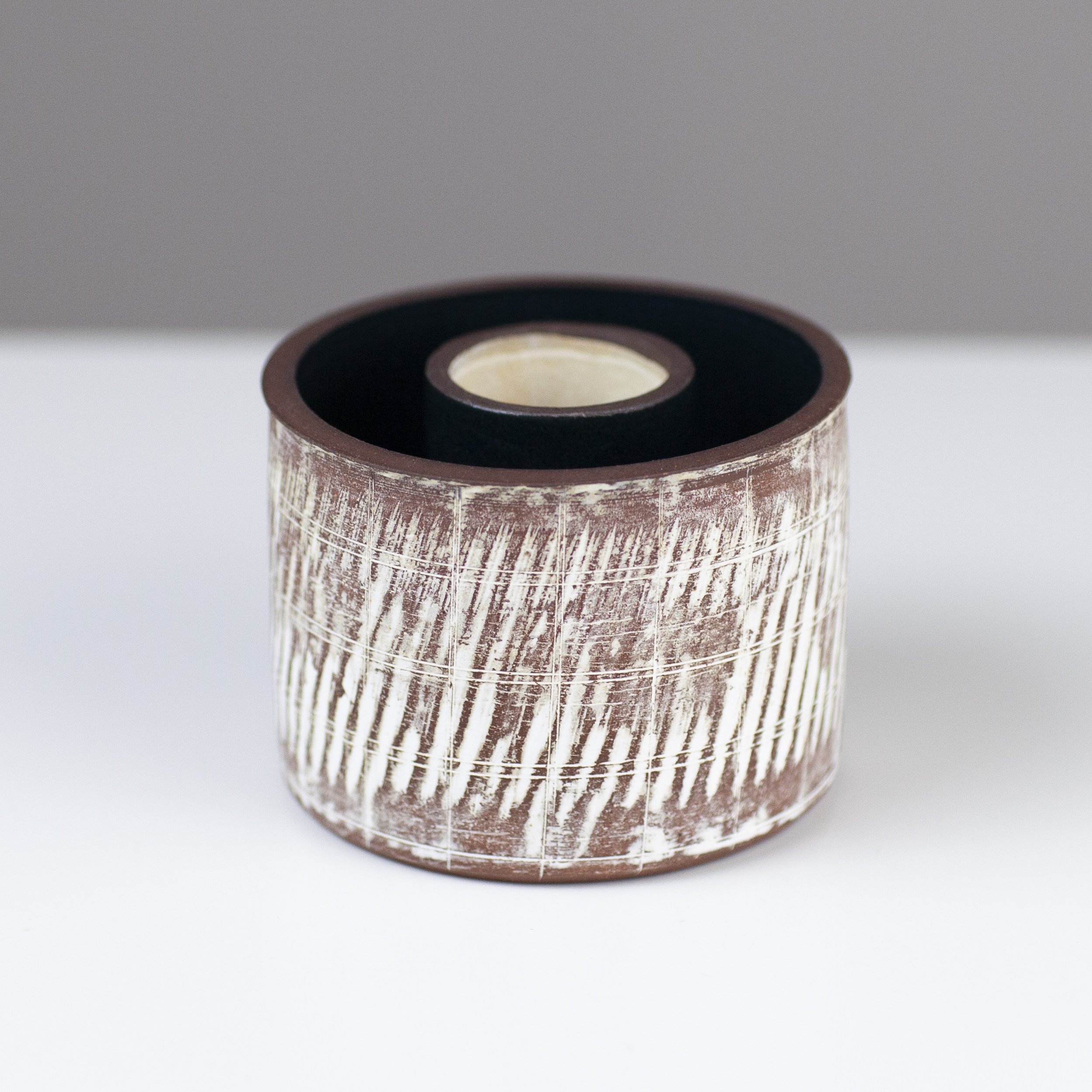 Emily is currently working with both porcelain and red stoneware clay. These contrasting clays provide the bright white, and chocolate brown backgrounds, on which the glazes react. The potter’s wheel is central to Emily’s studio practice, but extends her repertoire of forms by faceting, carving and altering the pots at the leather hard stage. She has developed a range of matt stoneware barium glazes. After graduating with a degree in Ceramics from Bristol Polytechnic in 1987, Emily returned to her home town of London, enjoying working within a shared workshop environment. A move to the countryside in the late 1990’s signalled a change in Emily’s work. Architectural influences gave way to organic ones. The rolling hills and ploughed furrows of North Hampshire were reflected in the carved lines within the pots. Inspiration was also drawn from found objects such as knapped flints and old metal cogs.