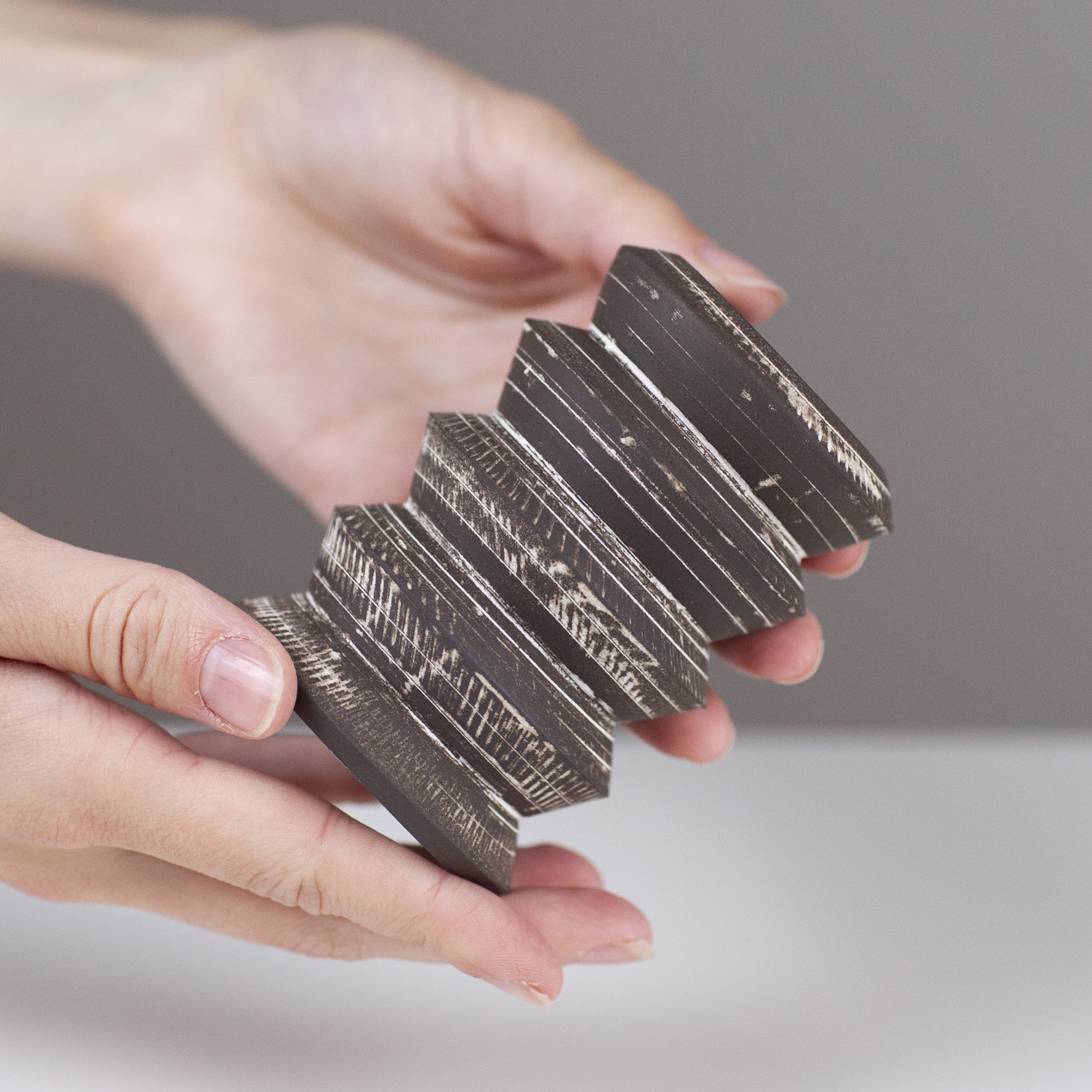 Emily is currently working with both porcelain and red stoneware clay. These contrasting clays provide the bright white, and chocolate brown backgrounds, on which the glazes react. The potter’s wheel is central to Emily’s studio practice, but extends her repertoire of forms by faceting, carving and altering the pots at the leather hard stage. She has developed a range of matt stoneware barium glazes. After graduating with a degree in Ceramics from Bristol Polytechnic in 1987, Emily returned to her home town of London, enjoying working within a shared workshop environment. A move to the countryside in the late 1990’s signalled a change in Emily’s work. Architectural influences gave way to organic ones. The rolling hills and ploughed furrows of North Hampshire were reflected in the carved lines within the pots. Inspiration was also drawn from found objects such as knapped flints and old metal cogs.