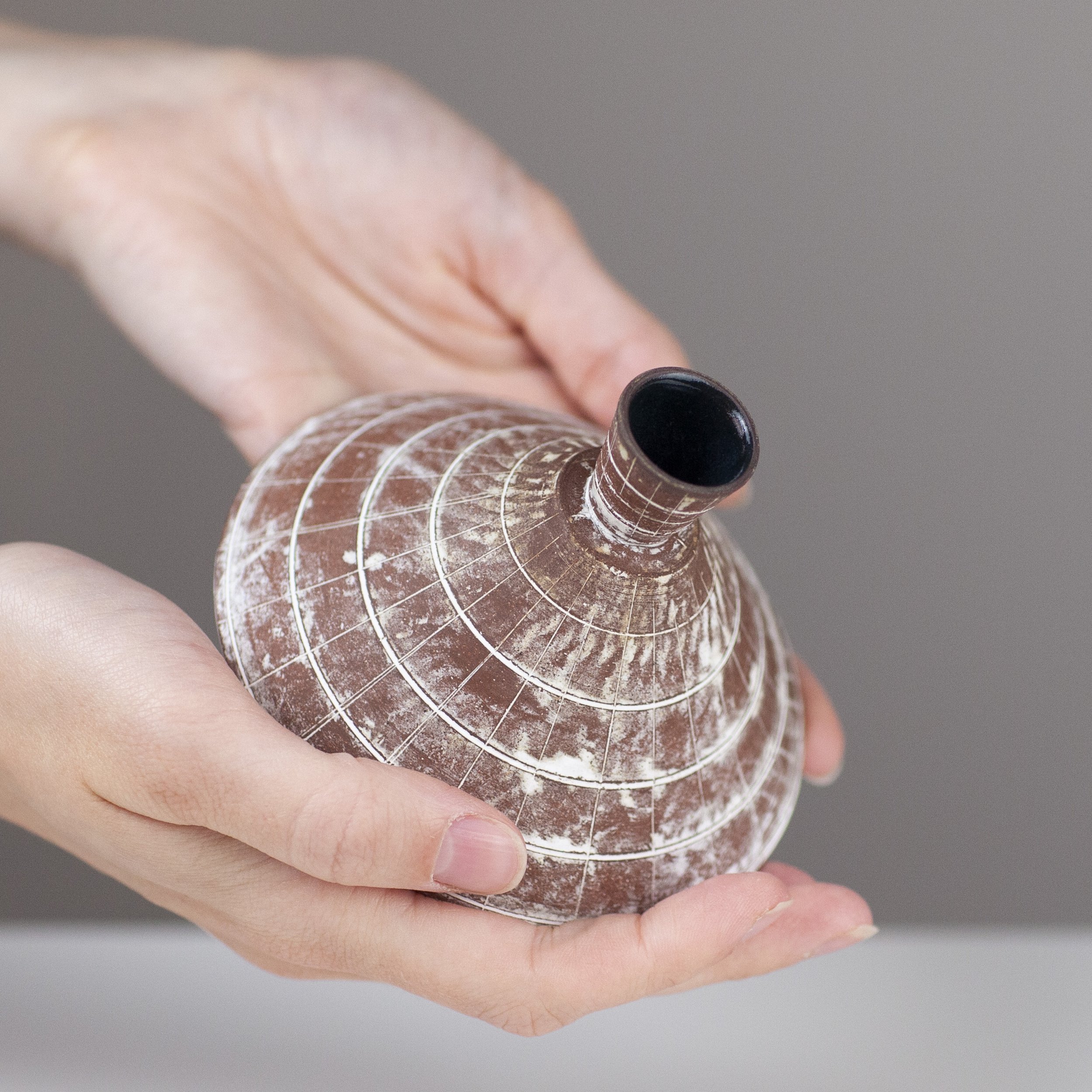Emily is currently working with both porcelain and red stoneware clay. These contrasting clays provide the bright white, and chocolate brown backgrounds, on which the glazes react. The potter’s wheel is central to Emily’s studio practice, but extends her repertoire of forms by faceting, carving and altering the pots at the leather hard stage. She has developed a range of matt stoneware barium glazes. After graduating with a degree in Ceramics from Bristol Polytechnic in 1987, Emily returned to her home town of London, enjoying working within a shared workshop environment. A move to the countryside in the late 1990’s signalled a change in Emily’s work. Architectural influences gave way to organic ones. The rolling hills and ploughed furrows of North Hampshire were reflected in the carved lines within the pots. Inspiration was also drawn from found objects such as knapped flints and old metal cogs.