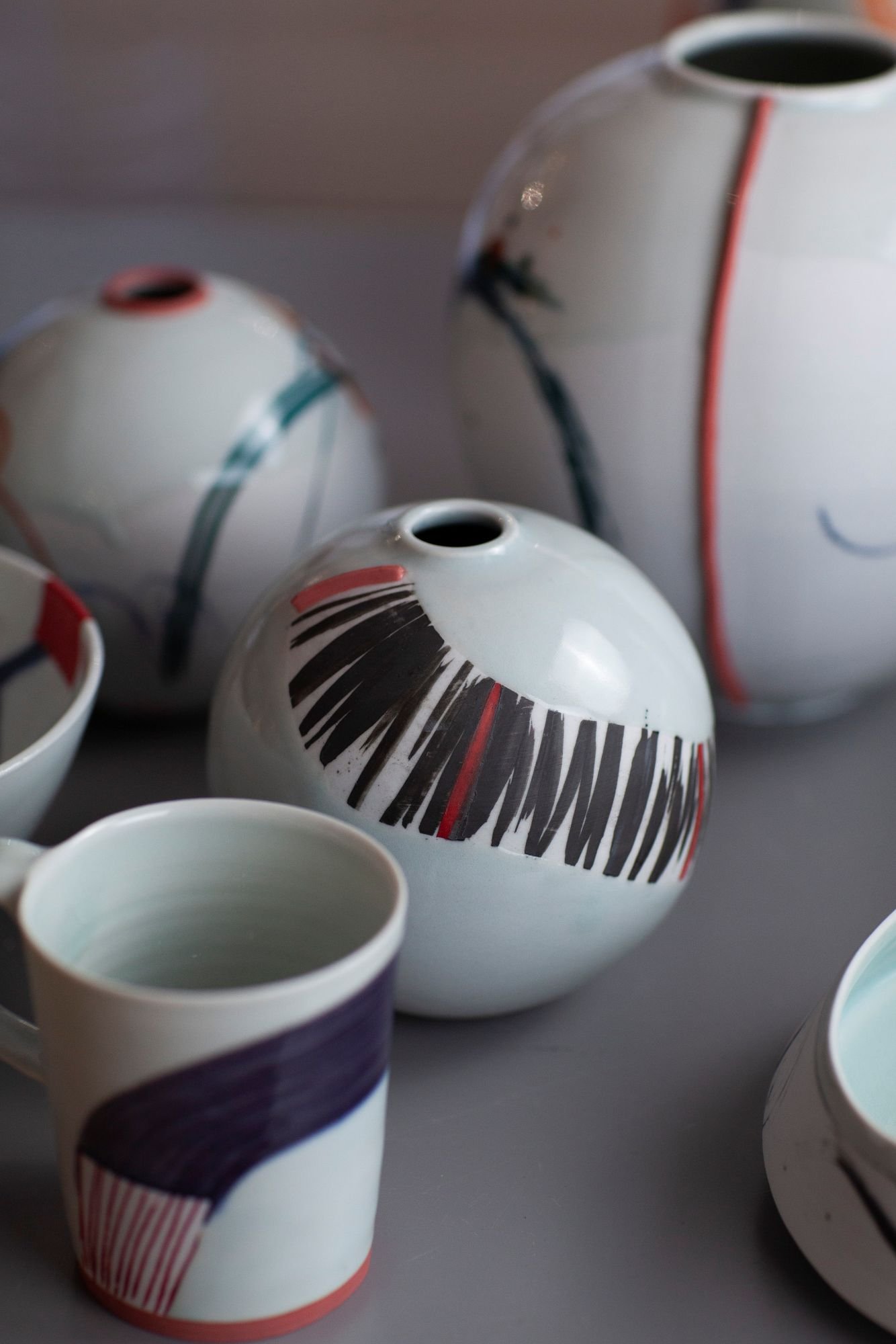 Adam’s work centres on the potters wheel. Traditional eastern forms inspire him, but spontaneity as a means of personal expression is key to his work. The exuberant action of throwing is enhanced by a continued experimentation through process, form and colour. Mark Making is intuitive, sometimes relating to form, or process of making, sometimes it’s part of a personal narrative