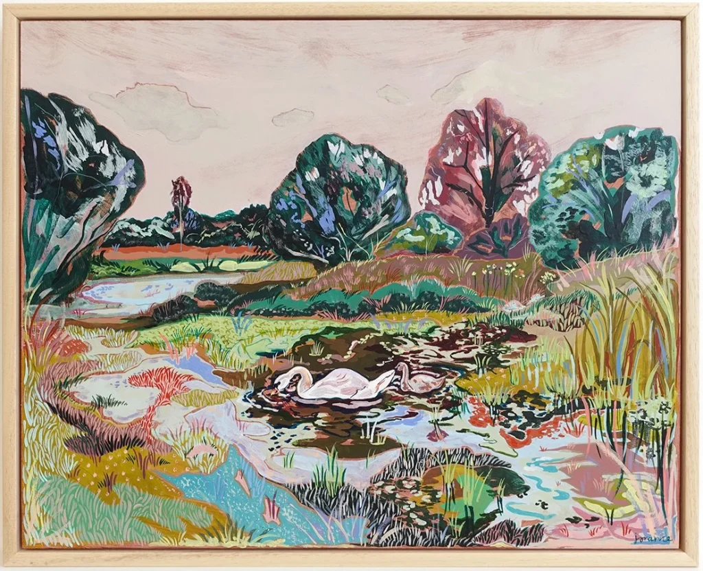Jo primarily works with acrylic on canvas in her studio. Through location drawing, Jo takes note of her surrounding countryside, and the flora and fauna within. Continuously informed by the British landscape throughout the seasons, there’s an organic pull for Jo to document the natural world through her work. A key part of her practice is painting en plein air and working in her sketchbook amidst the elements – it’s almost meditative.