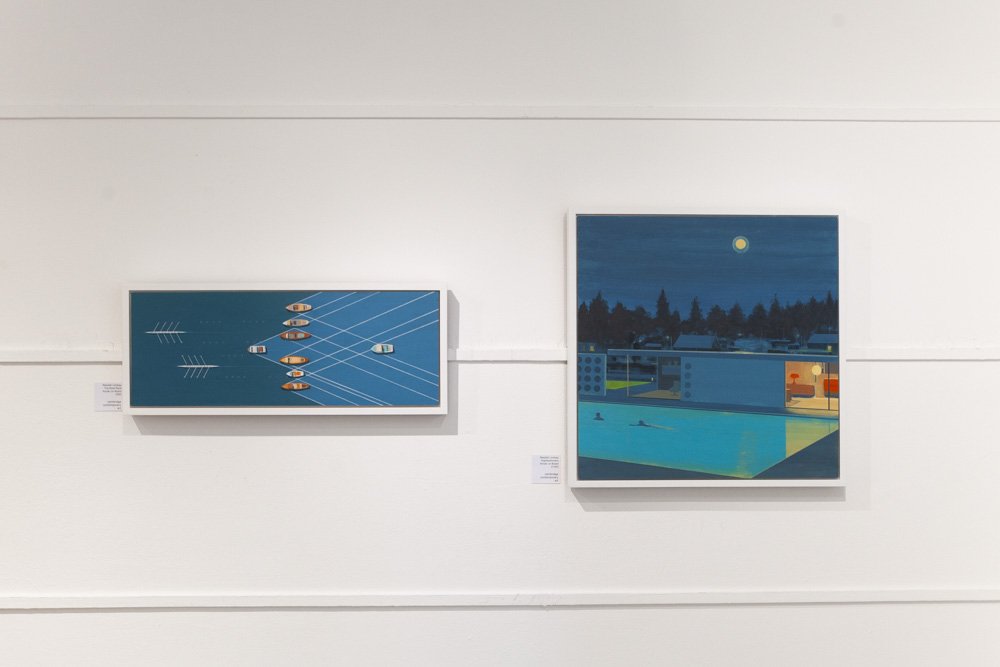 Although born in Cheshire, Alasdair has come to regard Cornwall as his home. He came to study at Falmouth College of Art and Design in 1996 and has remained ever since, now living with his family at Hayle. “Many of my Cornish paintings study the areas where sea meets land. I am drawn to the water – surfing, sea swimming and sailing all giving new perspectives, and for me an important part of enjoying life in Cornwall. Another perspective is viewing the landscape from above; inspired when I was young by seeing Peter Lanyon’s paintings . The grid like forms of aerial landscape and long, narrative shadows have also struck a chord with my way of working. Over the last few years I have been painting the Thames from above, along with subjects closer to home.”