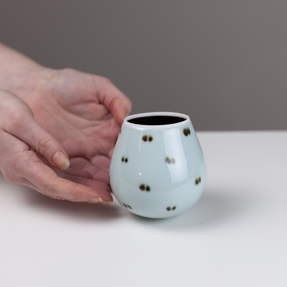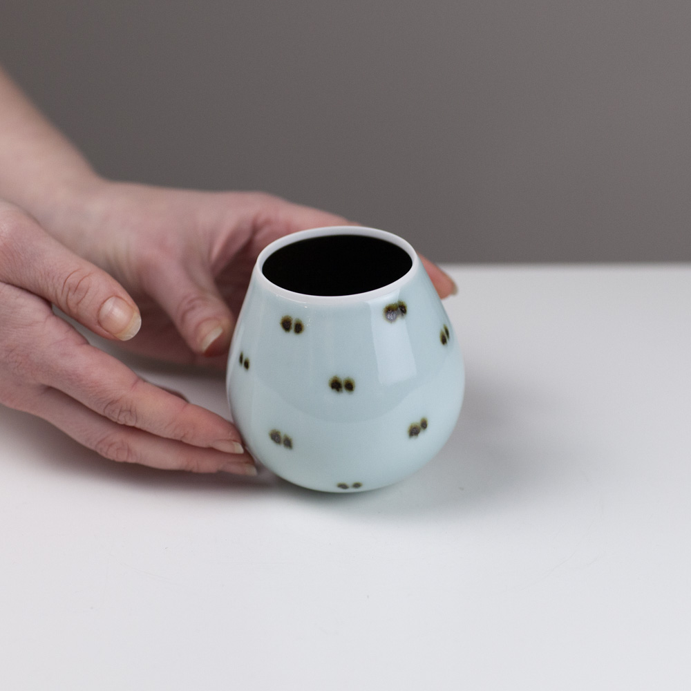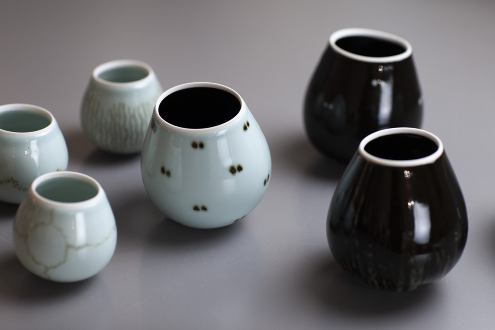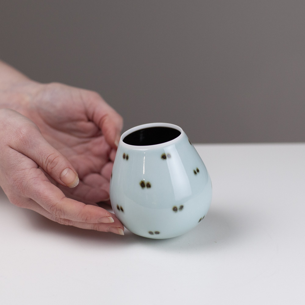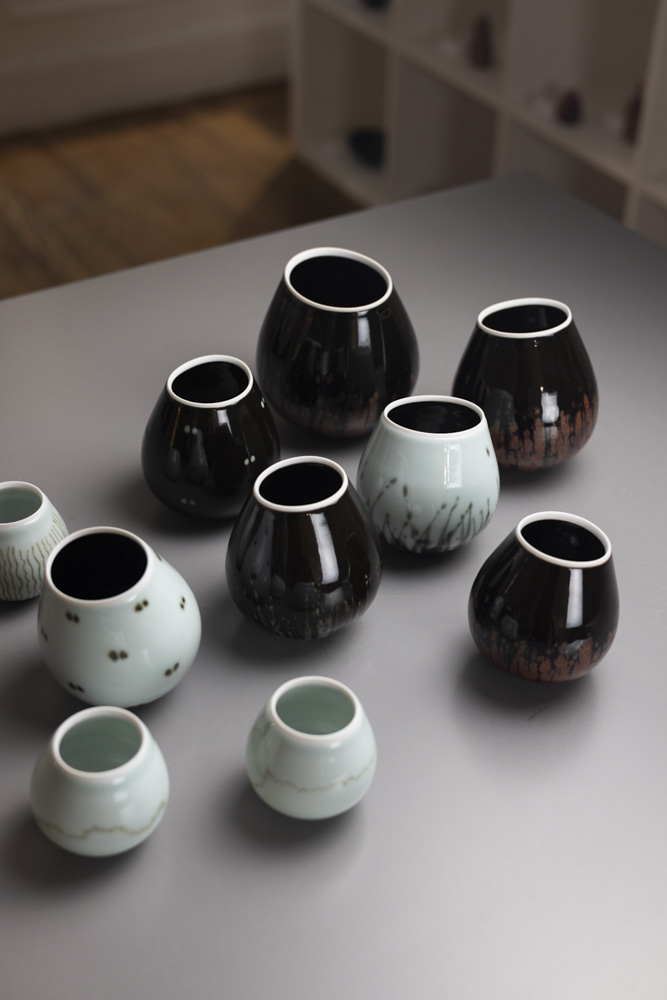 “There are few things that offer me greater satisfaction than being at the wheel, throwing or turning. My work and knowledge of clay occupies a fairly narrow band of the extremely broad ceramic spectrum but that band does go deep. I have only ever used porcelain and for the most part, only two glazes. I largely make work in small batches and for these, repetition is key; but the word “repetition” belies the reality that each piece represents a separate examination of the form in question and is a nuanced response to a previous incarnation.” Over the past few years, Chris has been making non-functional, interactive installation pieces which a sense of playfulness, incorporating elements of theatre which is a nod to his previous existence as an actor. All his work is thrown Limoges porcelain which is fired in a gas kiln with tenmoku and celadon glazes.