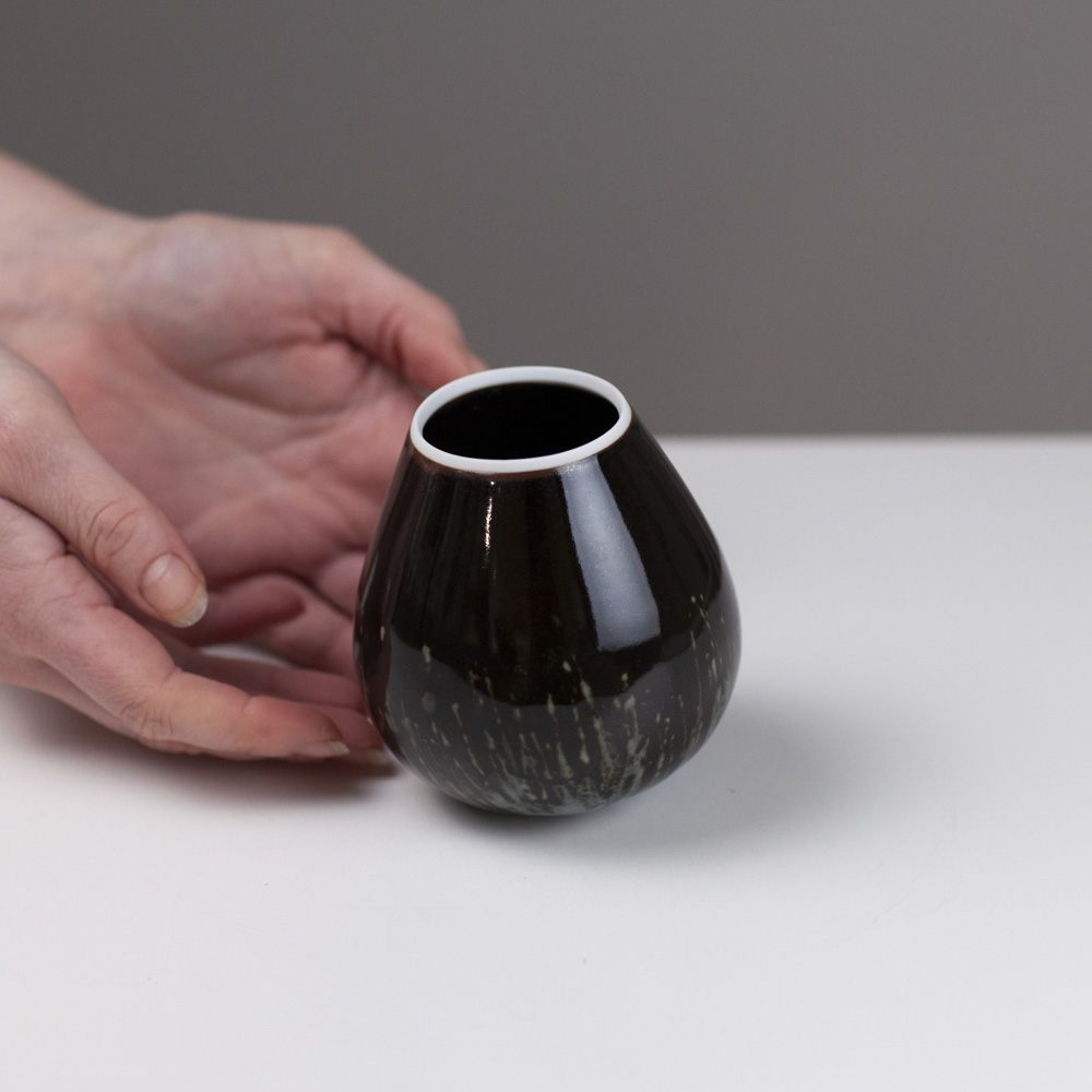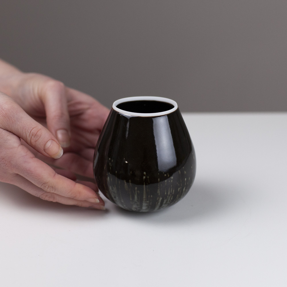 “There are few things that offer me greater satisfaction than being at the wheel, throwing or turning. My work and knowledge of clay occupies a fairly narrow band of the extremely broad ceramic spectrum but that band does go deep. I have only ever used porcelain and for the most part, only two glazes. I largely make work in small batches and for these, repetition is key; but the word “repetition” belies the reality that each piece represents a separate examination of the form in question and is a nuanced response to a previous incarnation.” Over the past few years, Chris has been making non-functional, interactive installation pieces which a sense of playfulness, incorporating elements of theatre which is a nod to his previous existence as an actor. All his work is thrown Limoges porcelain which is fired in a gas kiln with tenmoku and celadon glazes.