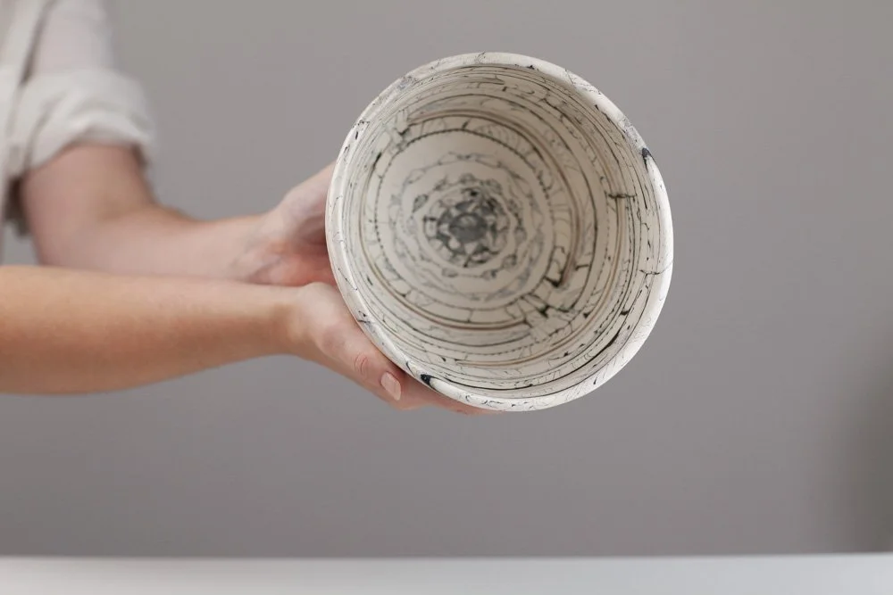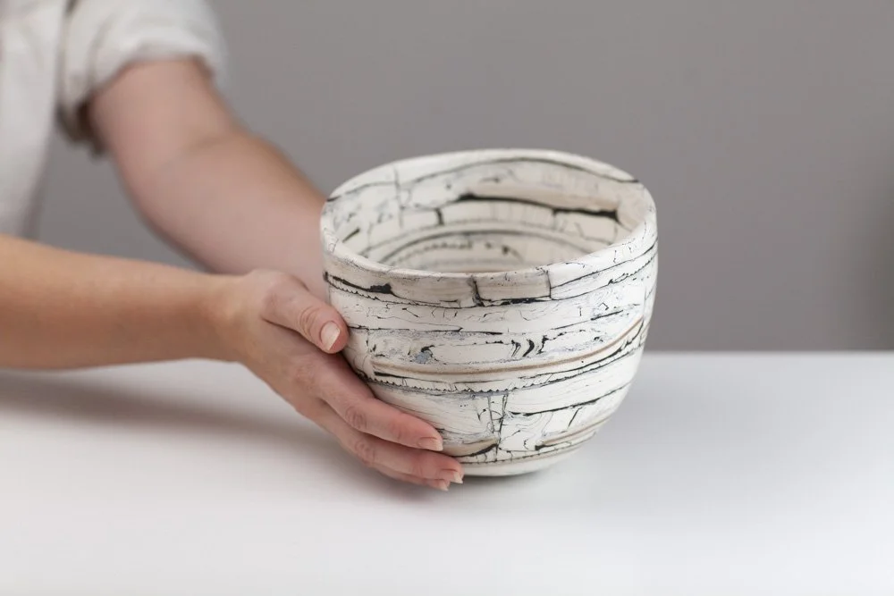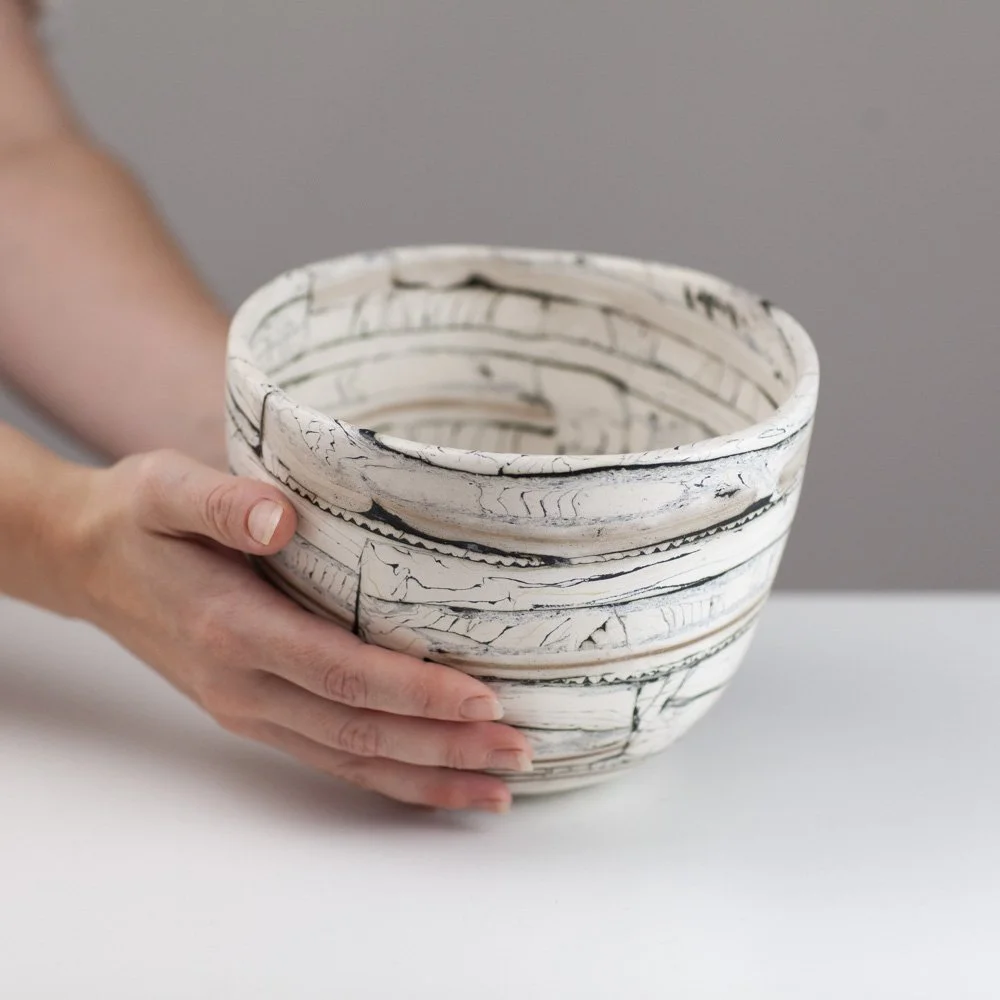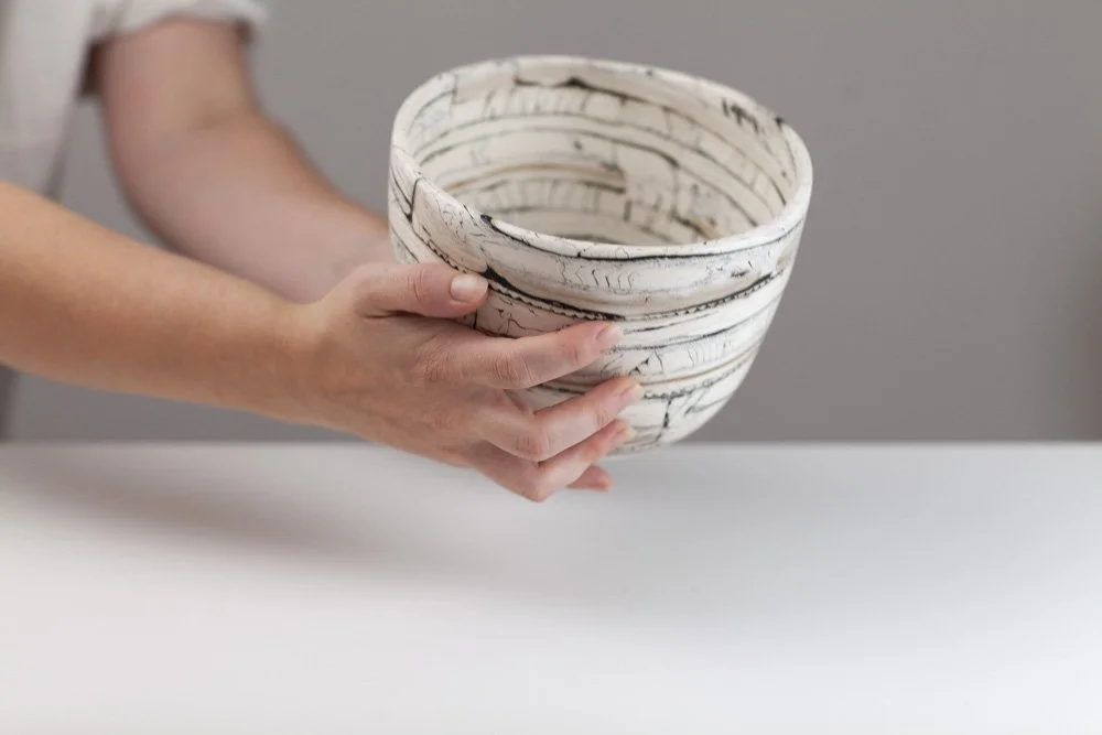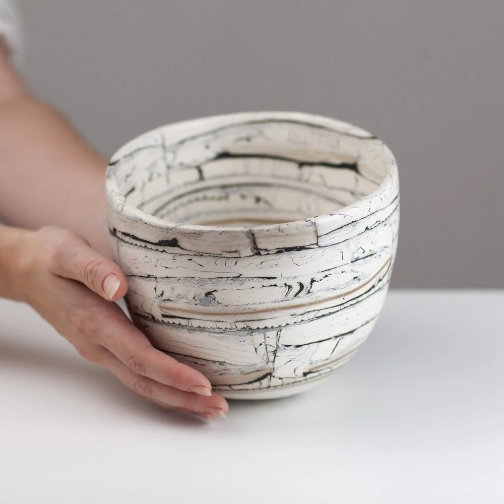 Barbara is a Brighton-based ceramicist, exhibiting across England. During her earlier career in the fashion industry as a designer and pattern cutter, she began to explore clay as an alternative medium to fabric. In fashion, the layering of textiles and the power of the cut merge to find new balances and forms, the biomorphic and geometric held in tension. Her work in clay continues to explore this. Barbara is fascinated by the geometry in nature. Growth and random chaotic forces skew and distort the initial perfect symmetry, leading to biomorphic and irregular forms. ”My ceramics explore the multi-layered effects nature creates via the laying down of strata, weathering and erosion. I endeavour to catch echoes of all this in my work whilst trying to embrace chance, the accidental and, as Henri Bergson said, the unforeseeable novelty.”