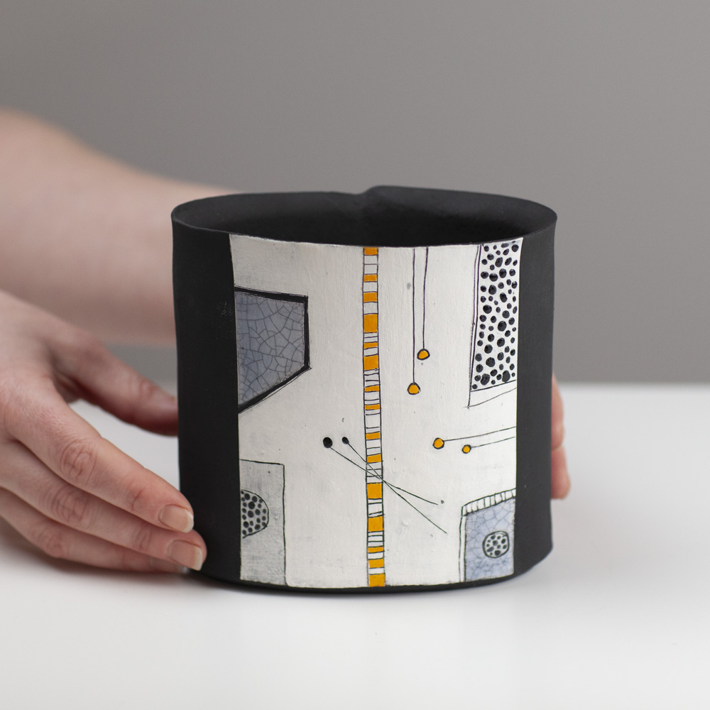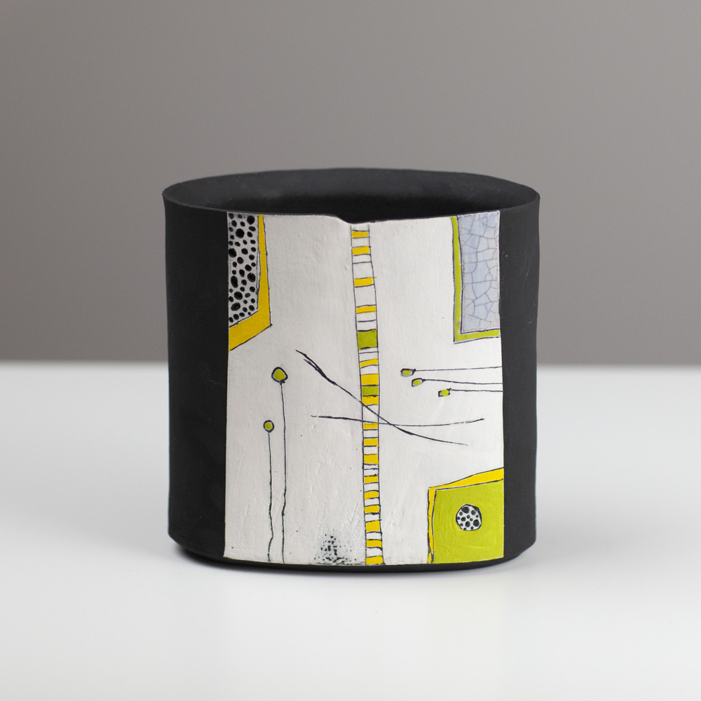 Her work is predominantly hand-built, using coiling, pinching, and slab techniques rather than the wheel, resulting in distinctive sculptural and decorative forms. Known for her strong use of colour, abstract surface design, and expressive shapes, Jane creates pieces that are often earthenware-fired, sometimes burnished or smoke-fired. Her artistic approach has been influenced by time spent in Asia, particularly its emphasis on simplicity and form