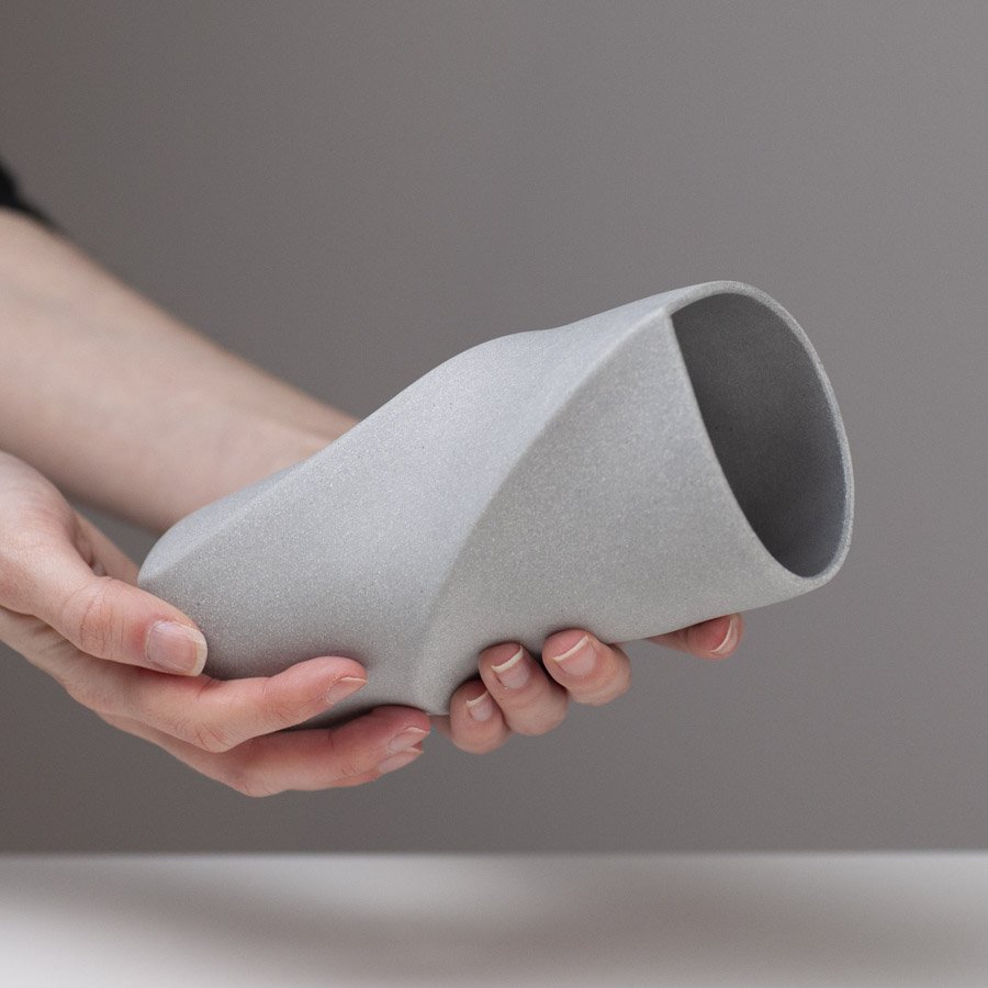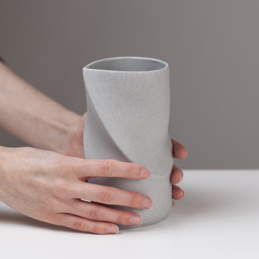 Sally’s ceramics are inspired by her passion for the material. She aims to create a sense of movement and physicality in her pieces; she does this by marking and drawing into soft slabs of clay that are then formed into cylinders and manipulated. This making process allows her to create unique forms with fluid contours and shadows. Natural colours and unglazed surfaces are used to complement the form and provide a subtle tactile quality to her vessels. Her primary material is a grogged porcelain which she then blends with other clays, oxides and stains in order to create her distinct colour palette.