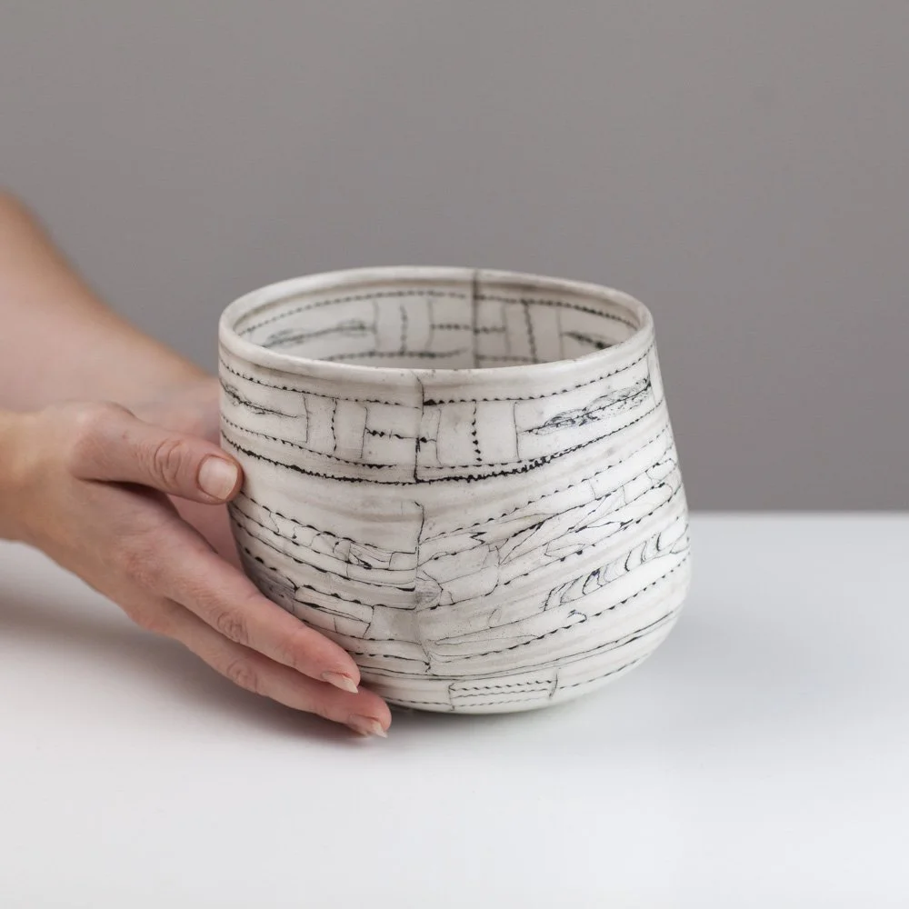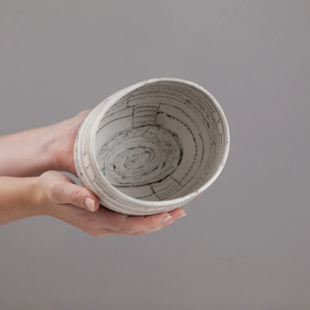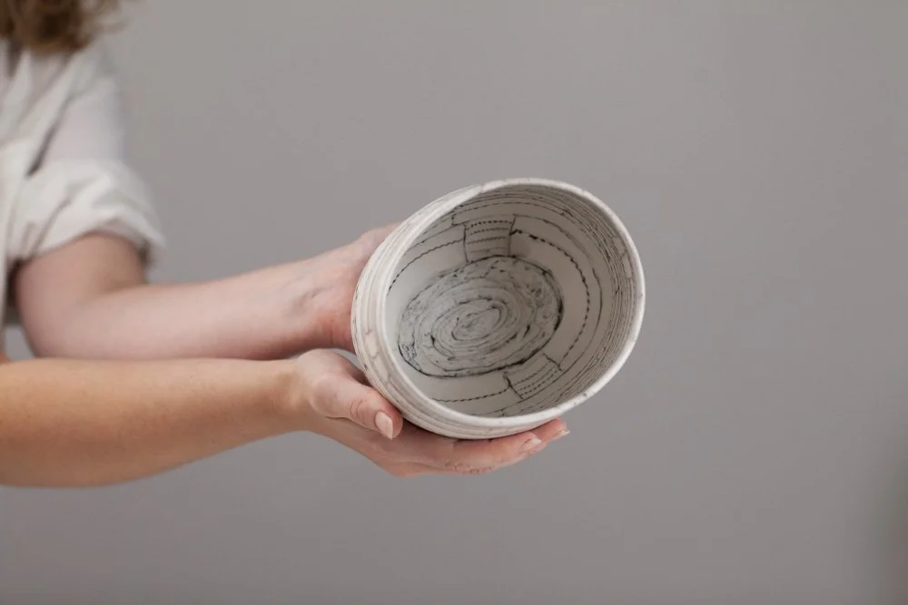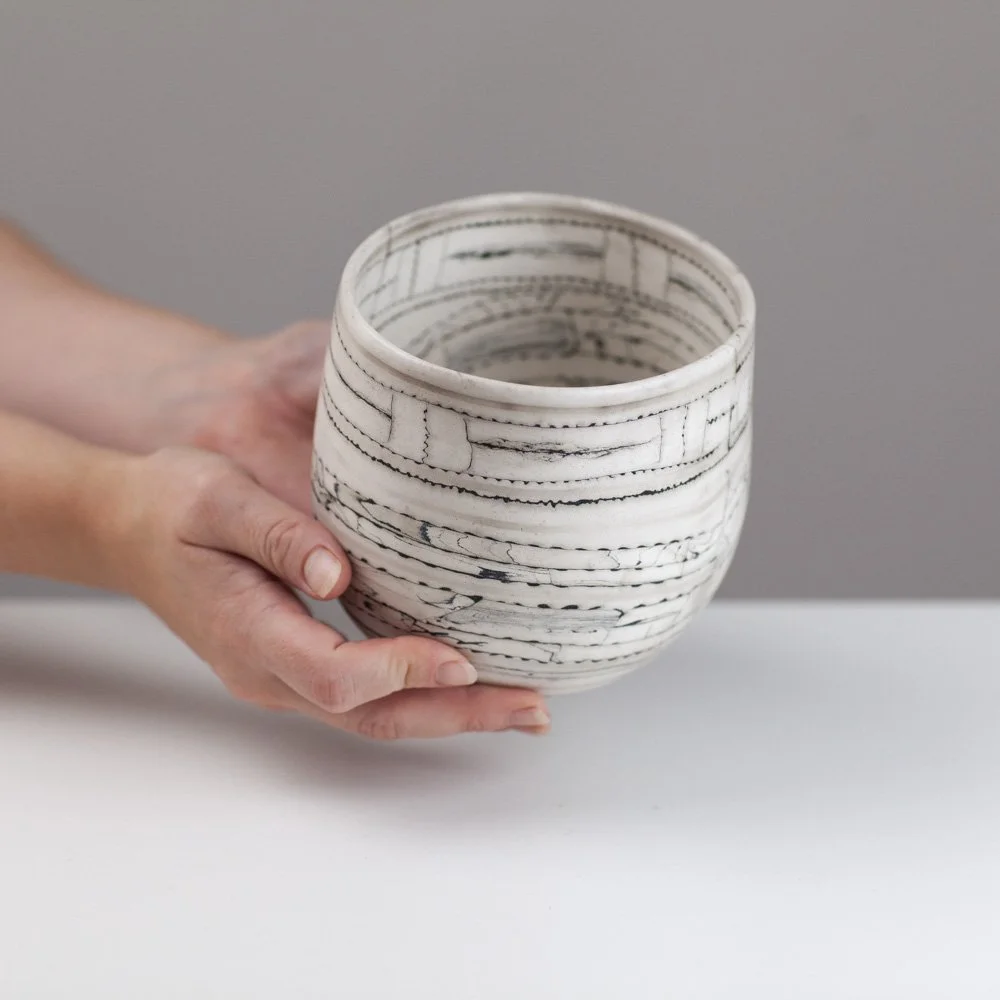 Barbara is a Brighton-based ceramicist, exhibiting across England. During her earlier career in the fashion industry as a designer and pattern cutter, she began to explore clay as an alternative medium to fabric. In fashion, the layering of textiles and the power of the cut merge to find new balances and forms, the biomorphic and geometric held in tension. Her work in clay continues to explore this. Barbara is fascinated by the geometry in nature. Growth and random chaotic forces skew and distort the initial perfect symmetry, leading to biomorphic and irregular forms. ”My ceramics explore the multi-layered effects nature creates via the laying down of strata, weathering and erosion. I endeavour to catch echoes of all this in my work whilst trying to embrace chance, the accidental and, as Henri Bergson said, the unforeseeable novelty.”