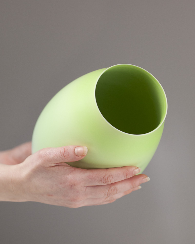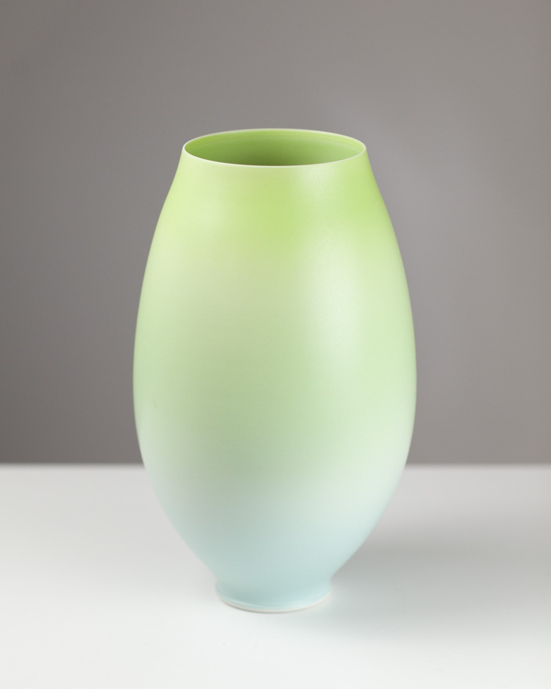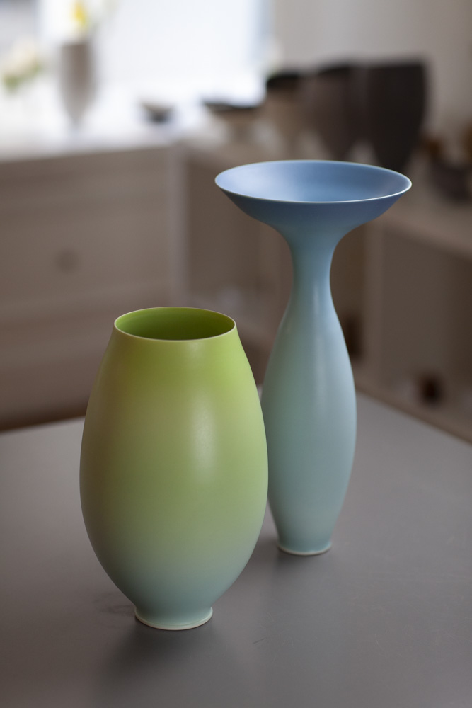 Anna Silverton’s finely wheel-thrown porcelain vases and bowls balance refined elegance and swooping curves. Made in a range of juicy colours and making a striking feature, in any setting. Silky-smooth glaze surfaces are punctuated with fine detail at the rim and base. Anna is known for her meticulous finishes and mastery of wheel throwing and glazing techniques. Consequently, she has been sought for public commissions including the Four Seasons Hotel and architectural projects around the world. Born in Gloucestershire, Anna trained in London at Camberwell School of Art. After gaining her MA at the Royal College of Art, she taught and had a workshop at Syracuse University in New York, USA. She returned to London in 1991 and set up her first studio with a Crafts Council Setting-Up Grant. She moved to Ramsgate in Kent in 2022 where she has set up her new workshop and home.