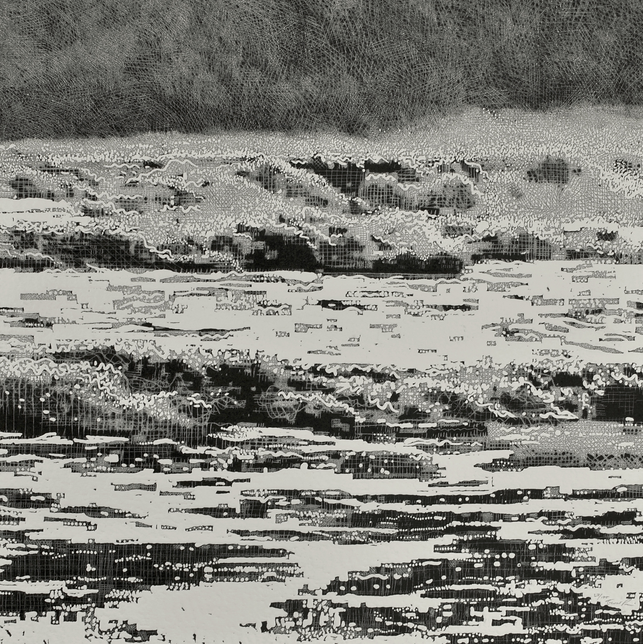The most recent series by Trevor Price are drypoint and engraved relief prints. Using a polycarbonate 2mm sheet he has carved and scraped the plate with a drypoint needle and a dremmel. This process is very time consuming and unforgiving if mistakes are made. With ink then rolled over the surface, it is sent through an etching press with damp paper over the plate. The artist’s intention is for the viewer to get lost in the mark making and abstractions when viewed close up, but from a distance for the images to become highly representational and almost photographic. There is however no photographic process involved and everything is handmade and printed by hand.