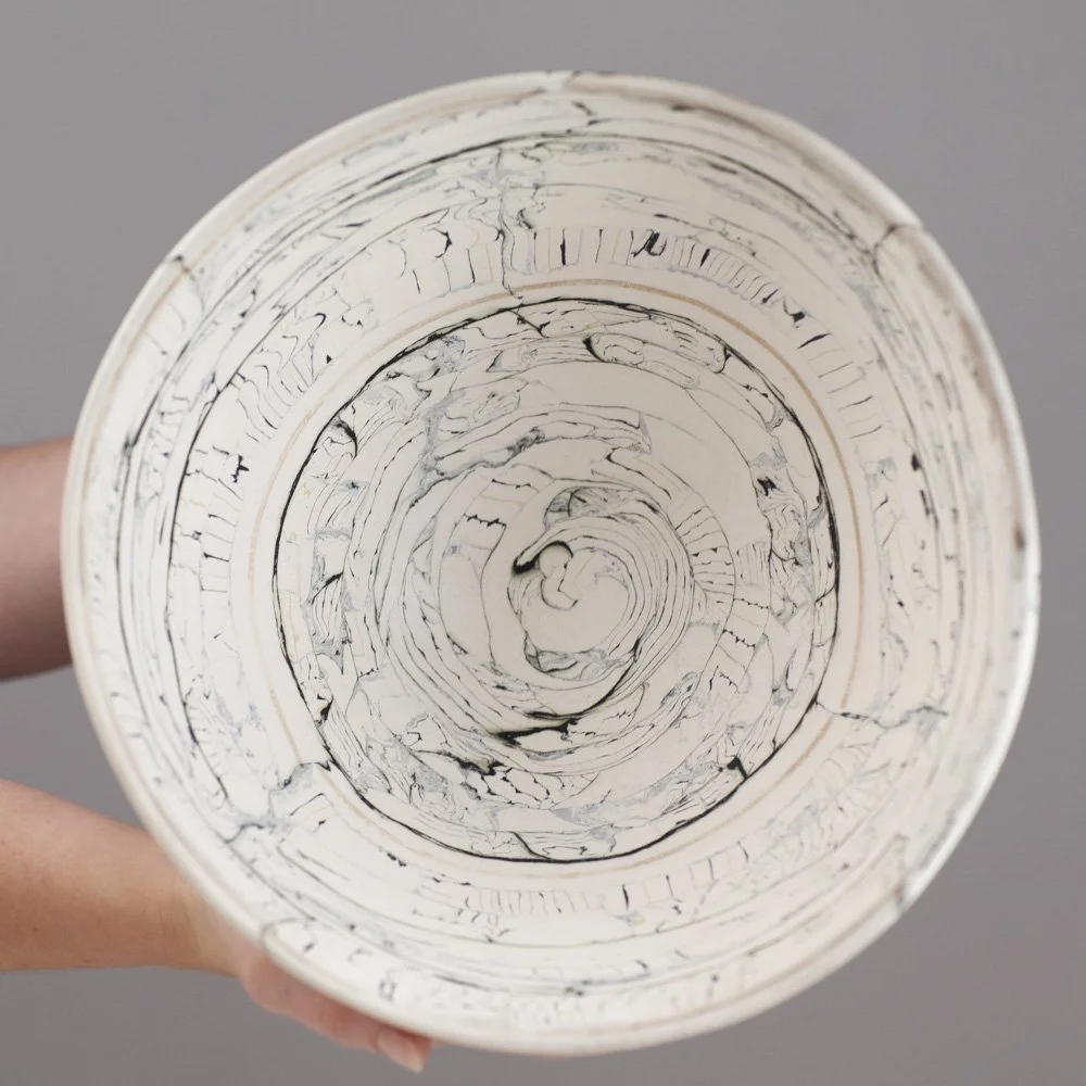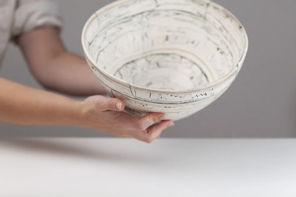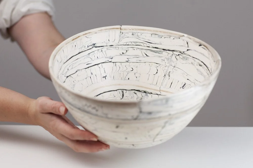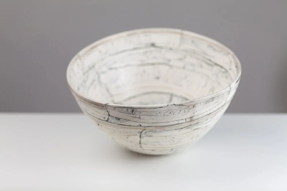 Barbara is a Brighton-based ceramicist, exhibiting across England. During her earlier career in the fashion industry as a designer and pattern cutter, she began to explore clay as an alternative medium to fabric. In fashion, the layering of textiles and the power of the cut merge to find new balances and forms, the biomorphic and geometric held in tension. Her work in clay continues to explore this. Barbara is fascinated by the geometry in nature. Growth and random chaotic forces skew and distort the initial perfect symmetry, leading to biomorphic and irregular forms. ”My ceramics explore the multi-layered effects nature creates via the laying down of strata, weathering and erosion. I endeavour to catch echoes of all this in my work whilst trying to embrace chance, the accidental and, as Henri Bergson said, the unforeseeable novelty.”