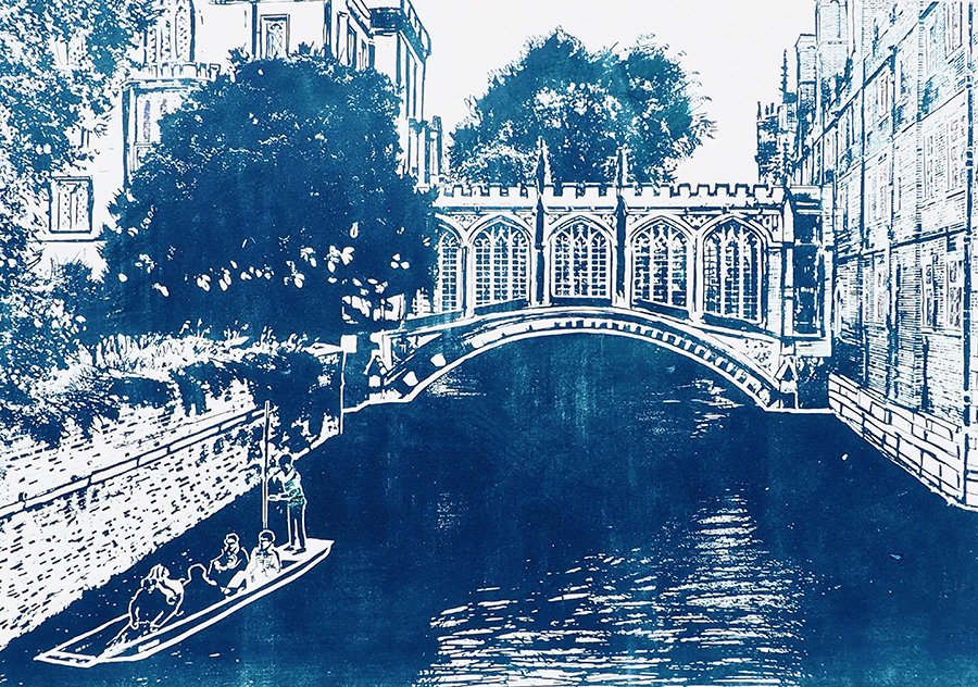 Jo’s practice often depicts landscapes and she sometimes includes the encroachment of urbanity. It is the juxtaposition of these two themes that interest her, and form the basis of her work. Jo is captivated by process – either by the layering of oil paint on canvas, or by ink and paper through printmaking. Jo’s original hand-pulled prints focus on relief methods, primarily solarplate™ and woodcut. Chine collé, silver or gold leaf or watercolour pencils are often added after the print has been pulled on her hand-built press set within her Cambridge studio.