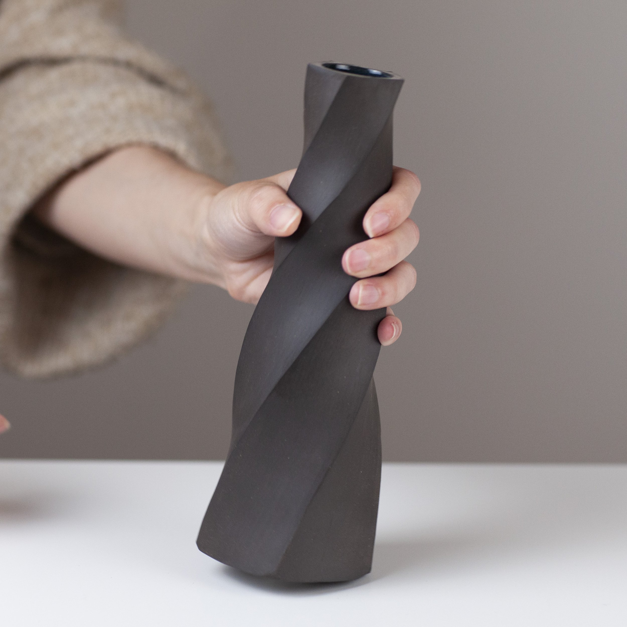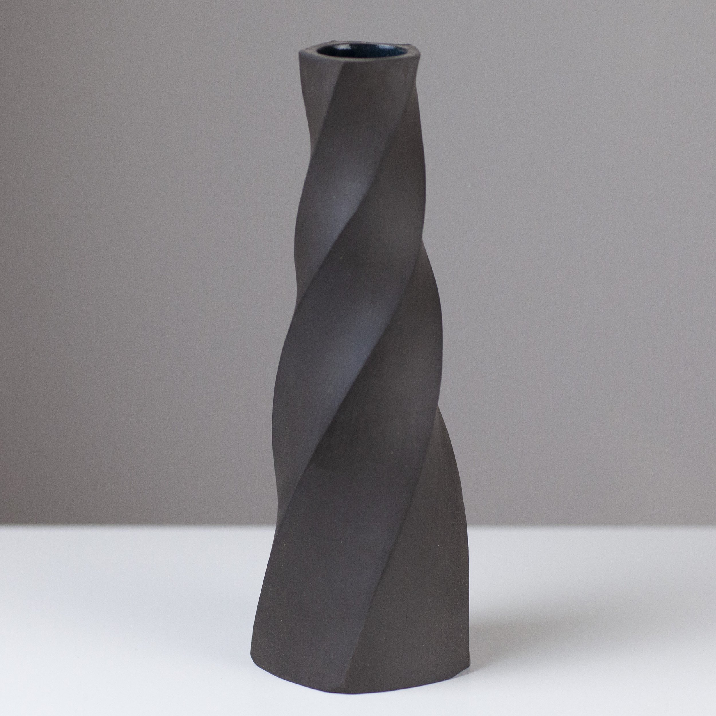 Emily is currently working with both porcelain and red stoneware clay. These contrasting clays provide the bright white, and chocolate brown backgrounds, on which the glazes react. The potter’s wheel is central to Emily’s studio practice, but extends her repertoire of forms by faceting, carving and altering the pots at the leather hard stage. She has developed a range of matt stoneware barium glazes. After graduating with a degree in Ceramics from Bristol Polytechnic in 1987, Emily returned to her home town of London, enjoying working within a shared workshop environment. A move to the countryside in the late 1990’s signalled a change in Emily’s work. Architectural influences gave way to organic ones. The rolling hills and ploughed furrows of North Hampshire were reflected in the carved lines within the pots. Inspiration was also drawn from found objects such as knapped flints and old metal cogs.
