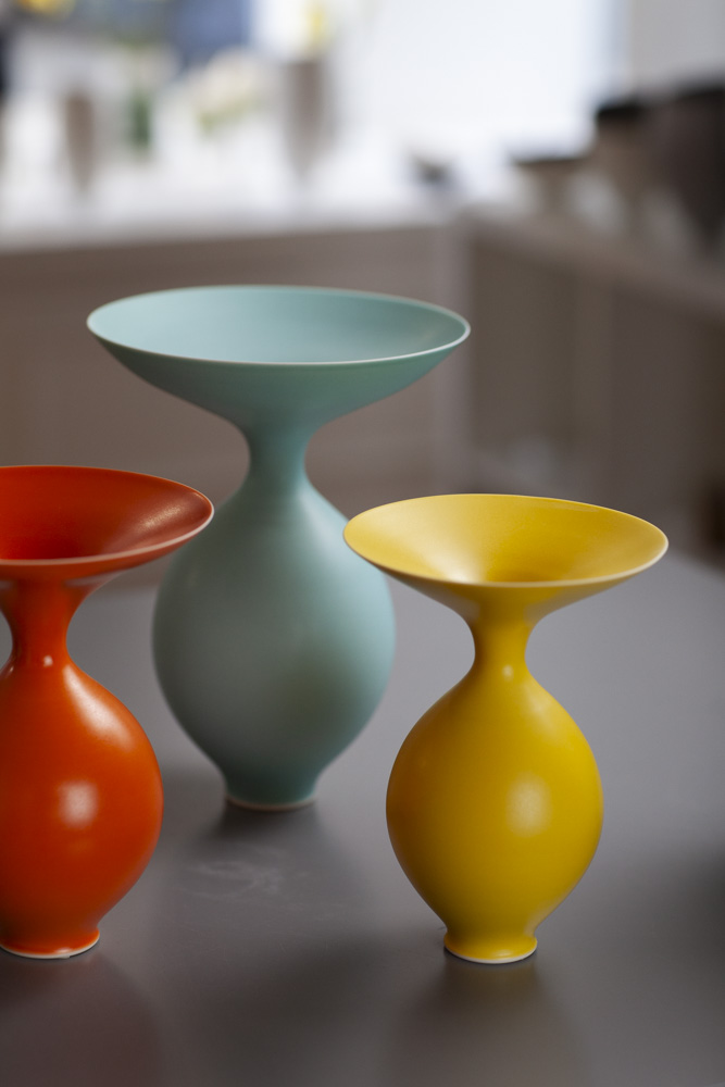 Anna Silverton’s finely wheel-thrown porcelain vases and bowls balance refined elegance and swooping curves. Made in a range of juicy colours and making a striking feature, in any setting. Silky-smooth glaze surfaces are punctuated with fine detail at the rim and base. Anna is known for her meticulous finishes and mastery of wheel throwing and glazing techniques. Consequently, she has been sought for public commissions including the Four Seasons Hotel and architectural projects around the world. Born in Gloucestershire, Anna trained in London at Camberwell School of Art. After gaining her MA at the Royal College of Art, she taught and had a workshop at Syracuse University in New York, USA. She returned to London in 1991 and set up her first studio with a Crafts Council Setting-Up Grant. She moved to Ramsgate in Kent in 2022 where she has set up her new workshop and home.