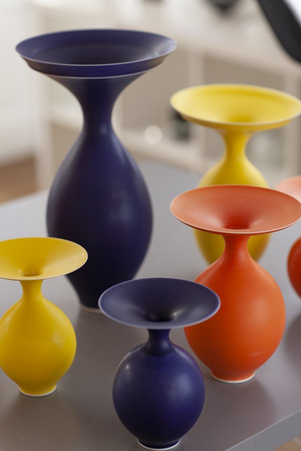 Anna Silverton’s finely wheel-thrown porcelain vases and bowls balance refined elegance and swooping curves. Made in a range of juicy colours and making a striking feature, in any setting. Silky-smooth glaze surfaces are punctuated with fine detail at the rim and base. Anna is known for her meticulous finishes and mastery of wheel throwing and glazing techniques. Consequently, she has been sought for public commissions including the Four Seasons Hotel and architectural projects around the world. Born in Gloucestershire, Anna trained in London at Camberwell School of Art. After gaining her MA at the Royal College of Art, she taught and had a workshop at Syracuse University in New York, USA. She returned to London in 1991 and set up her first studio with a Crafts Council Setting-Up Grant. She moved to Ramsgate in Kent in 2022 where she has set up her new workshop and home.