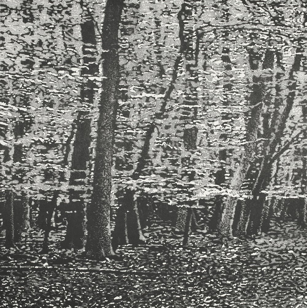 The most recent series by Trevor Price are drypoint and engraved relief prints. Using a polycarbonate 2mm sheet he has carved and scraped the plate with a drypoint needle and a dremmel. This process is very time consuming and unforgiving if mistakes are made. With ink then rolled over the surface, it is sent through an etching press with damp paper over the plate. The artist’s intention is for the viewer to get lost in the mark making and abstractions when viewed close up, but from a distance for the images to become highly representational and almost photographic. There is however no photographic process involved and everything is handmade and printed by hand.